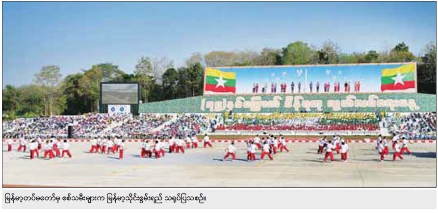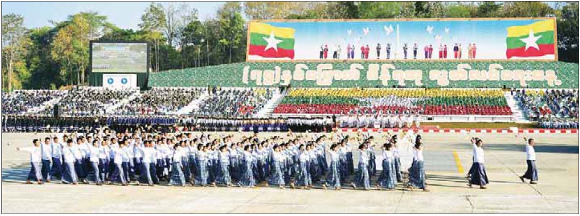 ဆက်လက်၍ မြန်မာနိုင်ငံအတွင်းရှိ တိုင်းဒေသကြီးနှင့် ပြည်နယ်တို့ရှိ ထင်ရှားသည့် အထိမ်းအမှတ်များ၊ လူနေမှုစရိုက်လက္ခဏာများ၊ ဓလေ့ထုံးတမ်း အစဉ်အလာများနှင့် ထုတ်ကုန်များကို သရုပ်ဖော်ပြသထားသည့် နေပြည်တော်ကောင်စီနယ်မြေ၊ ကချင်ပြည်နယ်၊ ကယားပြည်နယ်၊ ကရင်ပြည်နယ်၊ ချင်းပြည်နယ်၊ စစ်ကိုင်းတိုင်းဒေသကြီး၊ တနင်္သာရီတိုင်း ဒေသကြီး၊ ပဲခူးတိုင်းဒေသကြီး၊ မကွေးတိုင်းဒေသကြီး၊ မန္တလေးတိုင်းဒေသကြီး၊ မွန်ပြည်နယ်၊ ရခိုင်ပြည်နယ်၊ ရန်ကုန်တိုင်းဒေသကြီး၊ ရှမ်းပြည်နယ်၊ ဧရာဝတီတိုင်းဒေသကြီးတို့မှ ဂုဏ်ပြုယာဉ်များနှင့် ဖျော်ဖြေရေးအဖွဲ့များက တေးသီချင်းအကအလှများဖြင့်လည်းကောင်း၊ ပြည်ထဲရေးဝန်ကြီးဌာန၊ နိုင်ငံခြားရေးဝန်ကြီးဌာနနှင့် အပြည်ပြည်ဆိုင်ရာ ပူးပေါင်းဆောင် ရွက်ရေးဝန်ကြီးဌာန၊ နယ်စပ်ရေးရာဝန်ကြီးဌာန၊ စီမံကိန်းနှင့်ဘဏ္ဍာရေးဝန်ကြီးဌာန၊ ရင်းနှီးမြှုပ်နှံမှုနှင့် နိုင်ငံခြားစီးပွားဆက်သွယ်ရေးဝန်ကြီးဌာန၊ ဥပဒေရေးရာဝန်ကြီးဌာန၊ ပြန်ကြားရေးဝန်ကြီးဌာန၊ သာသနာရေးနှင့် ယဉ်ကျေးမှုဝန်ကြီးဌာန၊ စိုက်ပျိုးရေး၊ မွေးမြူရေးနှင့် ဆည်မြောင်းဝန်ကြီးဌာန၊ သမဝါယမနှင့် ကျေးလက်ဖွံ့ဖြိုးရေးဝန်ကြီးဌာန၊ ပို့ဆောင်ရေးနှင့် ဆက်သွယ်ရေးဝန်ကြီးဌာန၊ သယံဇာတနှင့်သဘာဝပတ်ဝန်းကျင်ထိန်းသိမ်းရေးဝန်ကြီးဌာန၊ လျှပ်စစ်စွမ်းအားဝန်ကြီးဌာန၊ စွမ်းအင်ဝန်ကြီးဌာန၊ စက်မှုဝန်ကြီးဌာန၊ လှုဝင်မှုကြီးကြပ်ရေးနှင့် ပြည်သူ့အင်အားဝန်ကြီးဌာန၊ အလုပ်သမားဝန်ကြီးဌာန၊ စီးပွားရေးနှင့် ကူးသန်းရောင်းဝယ်ရေး ဝန်ကြီးဌာန၊ ပညာရေးဝန်ကြီးဌာန၊ သိပ္ပံနှင့်နည်းပညာဝန်ကြီးဌာန၊ ကျန်းမာရေးဝန်ကြီးဌာန၊ အားကစားနှင့်လူငယ်ရေးရာဝန်ကြီးဌာန၊ ဆောက်လုပ်ရေးဝန်ကြီးဌာန၊ လူမှုဝန်ထမ်း၊ ကယ်ဆယ်ရေးနှင့် ပြန်လည်နေရာချထားရေးဝန်ကြီးဌာန၊ ဟိုတယ်နှင့်ခရီးသွားလာရေးဝန်ကြီး ဌာန၊ တိုင်းရင်းသားလူမျိုးများရေးရာဝန်ကြီးဌာနတို့မှ ဂုဏ်ပြုယာဉ်များက ဝန်ကြီးဌာနအလိုက် ဆောင်ရွက်မှုလုပ်ငန်းစဉ်များကို သရုပ်ဖော်ပြသ၍လည်းကောင်း ချီတက်သရုပ်ပြ ဖျော်ဖြေတင်ဆက်ကြသည်။