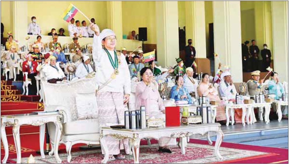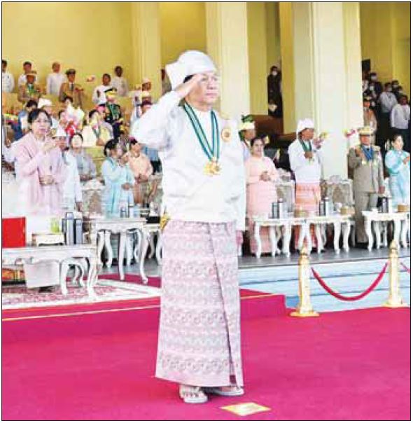 ချီတက်အလေးပြုစဉ် နိုင်ငံတော်စီမံအုပ်ချုပ်ရေးကောင်စီဥက္ကဋ္ဌ နိုင်ငံတော်ဝန်ကြီးချုပ်နှင့်ဇနီး၊ ဧည်သည်တော်များသည် ချီတက်အလေးပြုသည့် ဂုဏ်ပြုယာဉ်များ၊ သရုပ်ပြအဖွဲ့များနှင့် ဂုဏ်ပြု အကအဖွဲ့များကို ရင်းရင်းနှီးနှီး လက်ပြနှုတ်ဆက်ကြသည်။