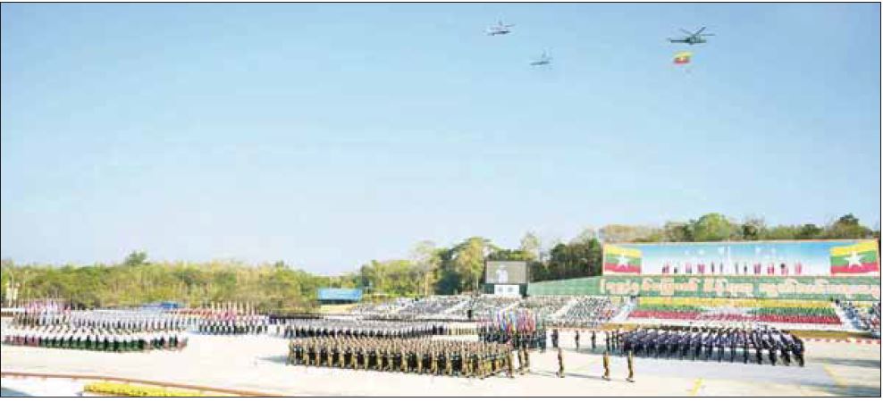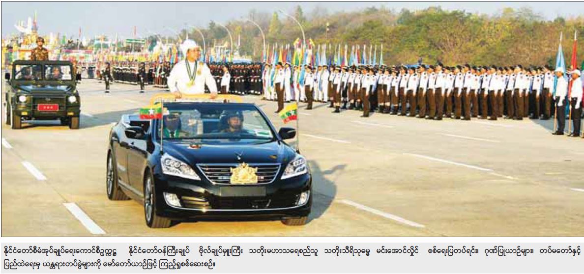 ထို့နောက် နိုင်ငံတော်စီမံအုပ်ချုပ်ရေးကောင်စီဥက္ကဋ္ဌ နိုင်ငံတော်ဝန်ကြီးချုပ် ဗိုလ်ချုပ်မှူးကြီး သတိုးမဟာသရေစည်သူ သတိုးသီရိသုဓမ္မ မင်းအောင်လှိုင်သည် စစ်ရေးပြတပ်ရင်း၊ ဂုဏ်ပြုယာဉ် များ၊ တပ်မတော်နှင့် ပြည်ထဲရေးမှ ယန္တရားတပ်ခွဲများကို မော်တော်ယာဉ်ဖြင့် ကြည့်ရှုစစ်ဆေးသည်။