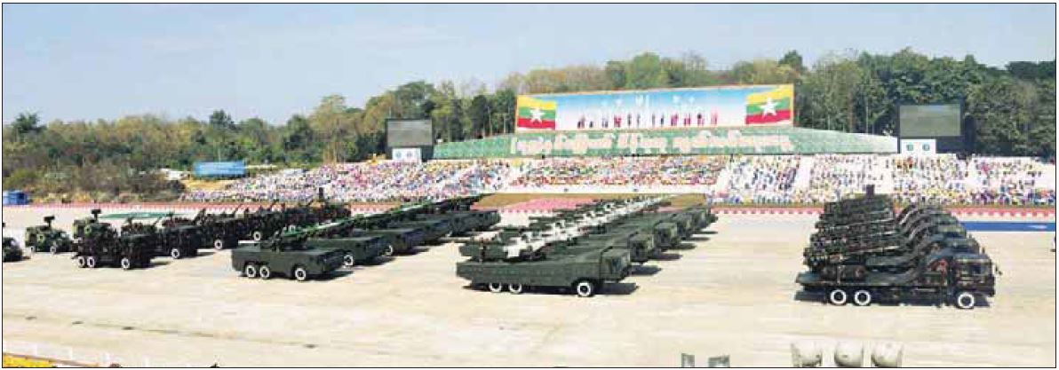 ထို့နောက် တပ်မတော်၏ ခေတ်အဆက်ဆက်ကို ဖော်ညွှန်းသည့်တပ်ခွဲများဖြစ်သော BIA တပ်ခွဲ၊ BDA တပ်ခွဲ၊ BNA တပ်ခွဲ၊ PBF တပ်ခွဲ၊ BA တပ်ခွဲ၊ ဘယ်ရီ တပ်ခွဲ၊ ဂေါ်ရခါးတပ်ခွဲ၊ ပွိုင့် ၃၀၃ တပ်ခွဲ၊ ၅၂ စတင်း တပ်ခွဲတို့နှင့်အတူ တပ်မတော်(ကြည်း) ဂုဏ်ပြုယာဉ် အမှတ်(၁)က လိုက်ပါချီတက်၍ လည်းကောင်း၊ တပ်မတော်(ကြည်း) ဂုဏ်ပြုယာဉ်အမှတ် (၂)က လည်းကောင်း၊ မြန်မာ့တပ်မတော်မှ စစ်သမီးများက မြန်မာ့သိုင်းစွမ်းရည်သရုပ်ပြသ၍ လည်းကောင်း၊ တပ်မတော်(ကြည်း) ဂုဏ်ပြုယာဉ် အမှတ်(၃)က လည်းကောင်း၊ မြန်မာ့တပ်မတော်မှစစ်သည်များက မြန်မာ့သိုင်းစွမ်းရည် သရုပ်ပြသ၍ လည်းကောင်း၊ တပ်မတော်(ရေ) ဂုဏ်ပြုယာဉ်ကလည်းကောင်း၊ အကြမ်းဖက်နှိမ်နင်းရေးတပ်နှင့် လုံခြုံရေးတပ်ရင်းမှ စစ်သည်များက စွမ်းရည်ပြကွက်များ ပြသ၍လည်းကောင်း၊ တပ်မတော်(လေ) ဂုဏ်ပြုယာဉ်ကလည်းကောင်း၊ ပြည်ထဲရေးဝန်ကြီးဌာန မြန်မာနိုင်ငံရဲတပ်ဖွဲ့မှ စစ်သည်များနှင့် ရဲမေများက စွမ်းရည်ပြကွက်များ ပြသ၍လည်းကောင်း ချီတက်အလေးပြုကြသည်။