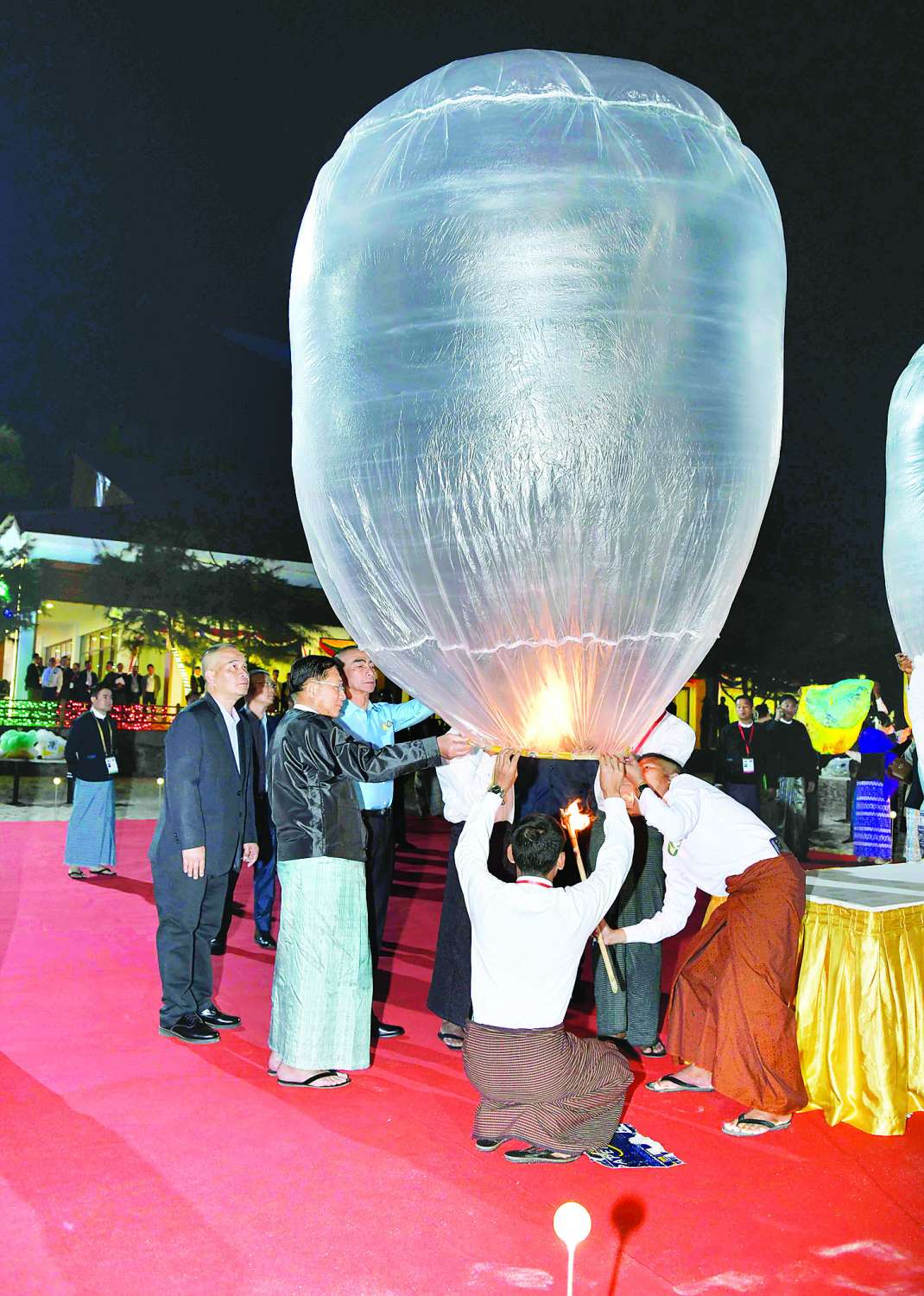 ထို့နောက် နိုင်ငံတော်စီမံအုပ်ချုပ်ရေးကောင်စီဥက္ကဋ္ဌ တပ်မတော်ကာကွယ်ရေးဦးစီးချုပ်နှင့်ဇနီး၊ ထိုင်းဘုရင့်တပ်မတော်ကာကွယ်ရေးဦးစီးချုပ်နှင့် ဇနီးတို့သည် (၈)ကြိမ်မြောက် မြန်မာ-ထိုင်း တပ်မတော်နှစ်ရပ်အကြား အဆင့်မြင့်အရာရှိကြီးများ အစည်းအဝေးအောင်မြင်ခြင်းအထိမ်းအမှတ်အဖြစ် မီးပုံးပျံများကို တက်ရောက်လာကြသည့် နှစ်ဘက်တပ်မတော်အရာရှိကြီးများနှင့်အတူ အတူတကွလွှတ်တင်ကြသည်။