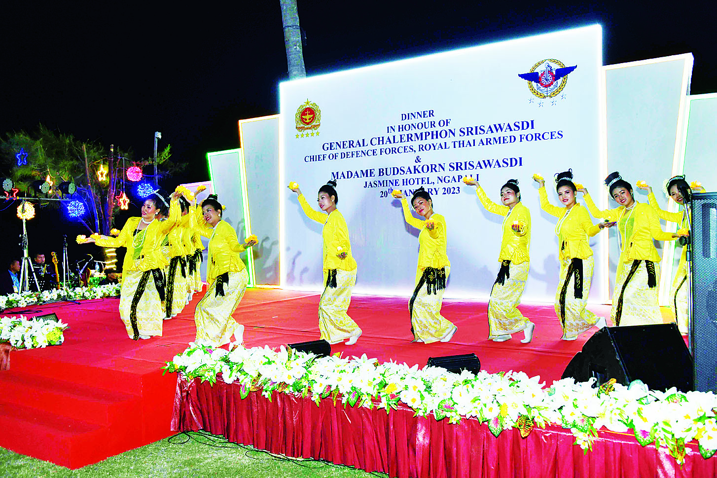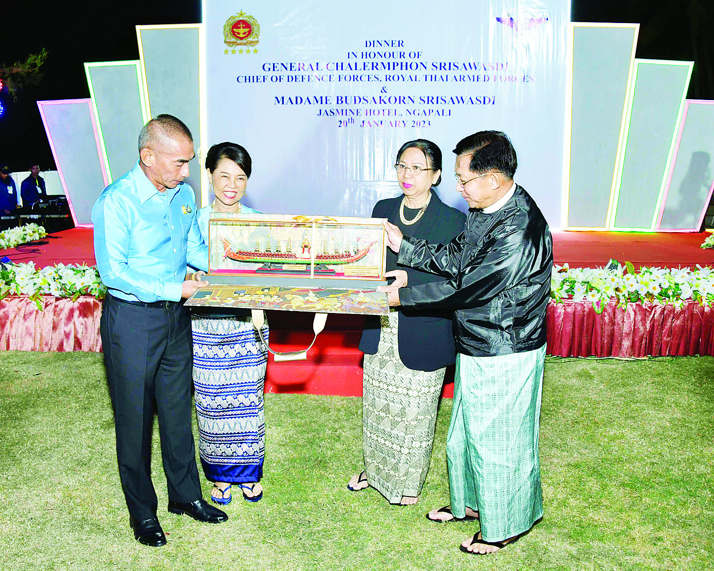 မြန်မာနိုင်ငံ၌ အိမ်ရှင်အဖြစ်လက်ခံကျင်းပပြုလုပ်ခဲ့သည့် (၈)ကြိမ်မြောက် မြန်မာ-ထိုင်း တပ်မတော်နှစ်ရပ်အကြား အဆင့်မြင့်အရာရှိကြီးများအစည်းအဝေး 8th High Level Committee Meeting သို့ တက်ရောက်ခဲ့သည့် ထိုင်းဘုရင့်တပ်မတော်ကာကွယ်ရေးဦးစီးချုပ် General Chalermphon Srisawasdi နှင့် ဇနီး Madame Budsakorn Srisawasdi ဦးဆောင်သည့် ကိုယ်စားလှယ်အဖွဲ့အား နိုင်ငံတော်စီမံအုပ်ချုပ်ရေးကောင်စီဥက္ကဋ္ဌ တပ်မတော်ကာကွယ်ရေးဦးစီးချုပ် ဗိုလ်ချုပ်မှူးကြီး မင်းအောင်လှိုင်နှင့် ဇနီး ဒေါ်ကြူကြူလှတို့က ယနေ့ညပိုင်းတွင် ရခိုင်ပြည်နယ်၊ သံတွဲမြို့၊ ငပလီကမ်းခြေရှိ Jasmine Ngapali Resort ၌ ဂုဏ်ပြုညစာဖြင့် တည်ခင်းဧည့်ခံသည်။