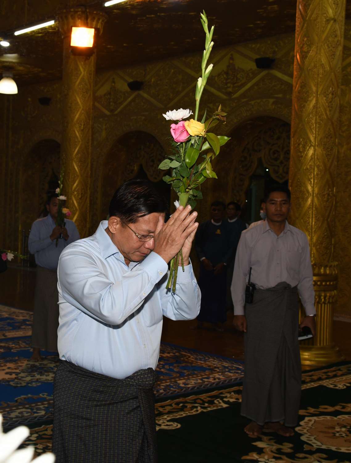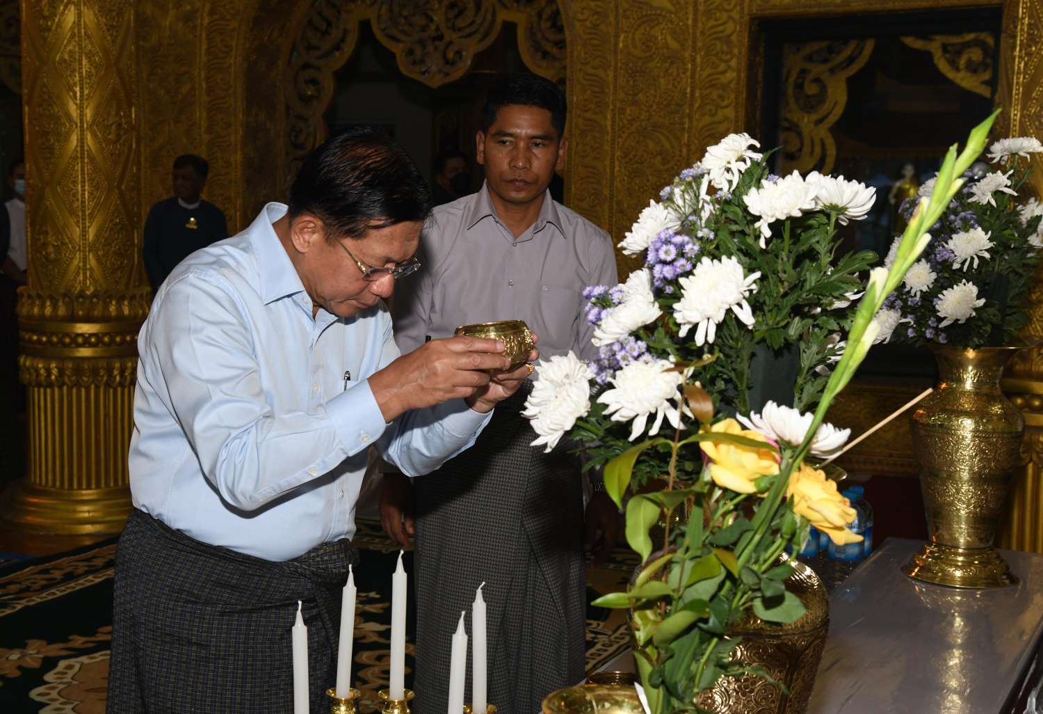 နိုင်ငံတော်စီမံအုပ်ချုပ်ရေးကောင်စီဥက္ကဋ္ဌ နိုင်ငံတော်ဝန်ကြီးချုပ် ဗိုလ်ချုပ်မှူးကြီးမင်းအောင်လှိုင်သည် ယနေ့ညပိုင်းတွင် ခရီးစဉ်တွင်လိုက်ပါလာသည့် အဖွဲ့ဝင်များ၊ ဧရာဝတီတိုင်းဒေသကြီးဝန်ကြီးချုပ် ဦးတင်မောင်ဝင်း၊ အနောက်တောင်တိုင်း စစ်ဌာနချုပ်တိုင်းမှူး ဗိုလ်မှူးချုပ်ကြည်ခိုင်နှင့် တာဝန်ရှိသူများလိုက်ပါ၍ ပုသိမ်မြို့ကျက်သရေဆောင် ရွှေမုဋ္ဌောမဟာစေတီတော်မြတ်ကြီးသို့ သွားရောက်ဖူးမြော် ကြည်ညိုသည်။