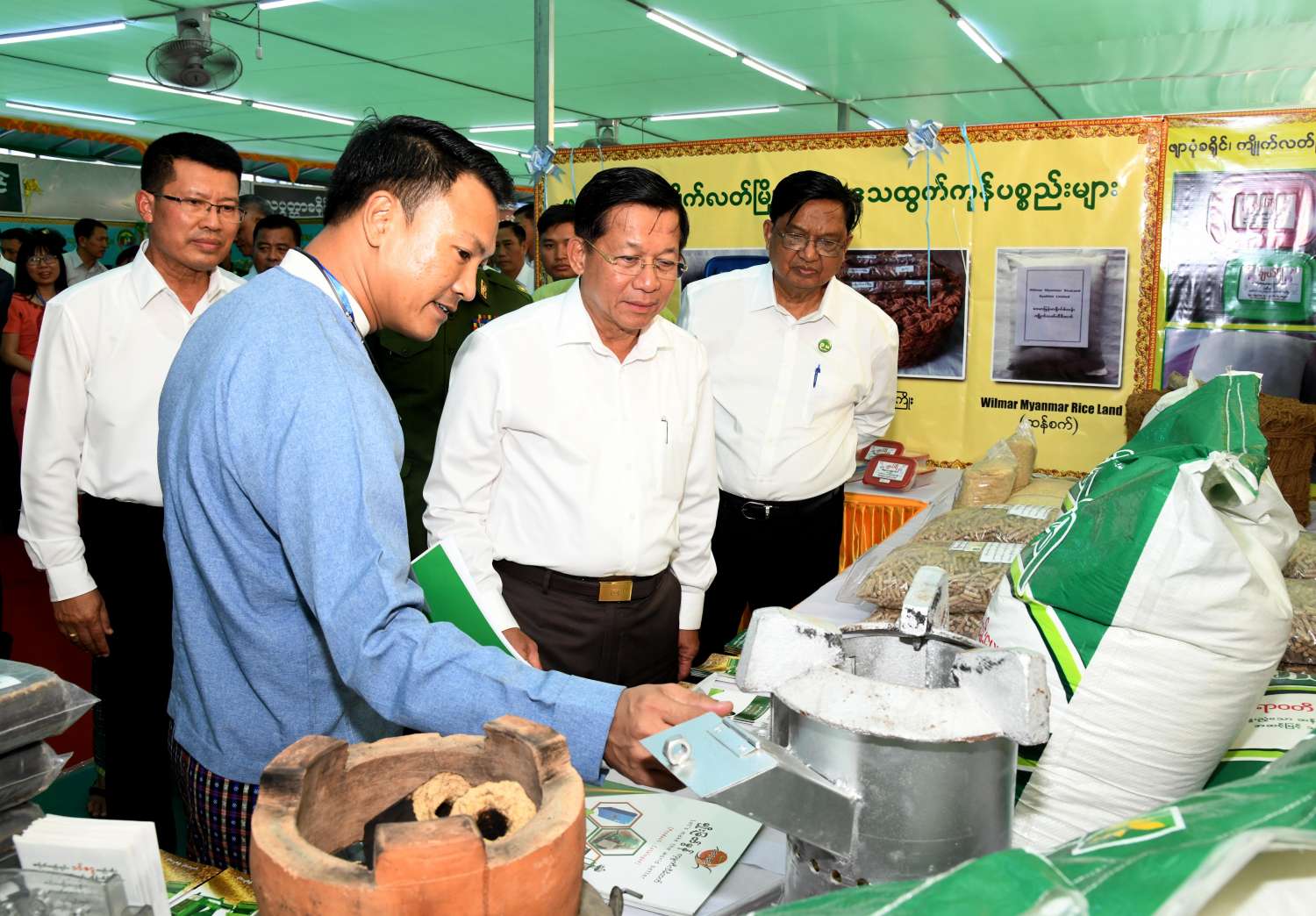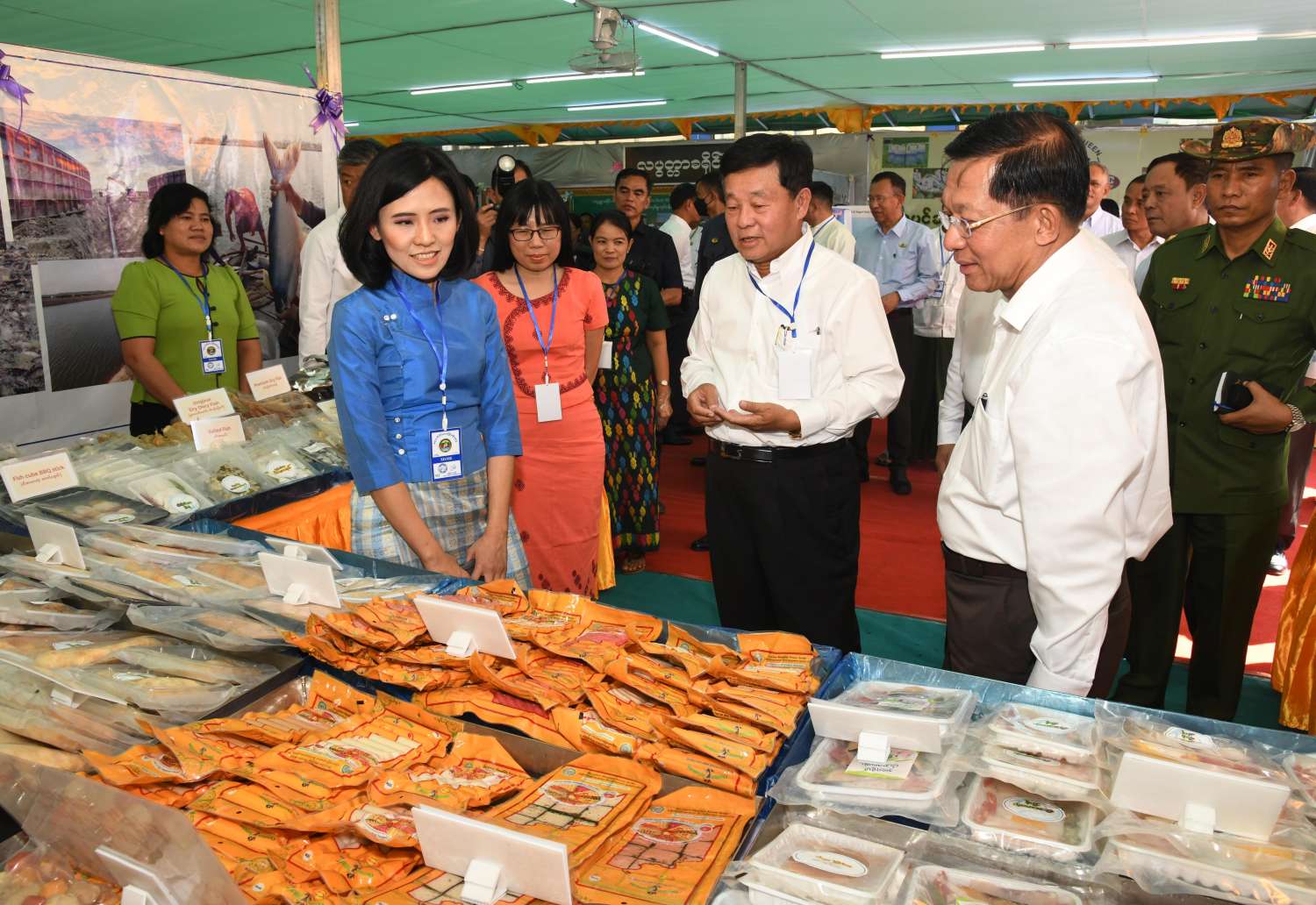 ယင်းနောက် နိုင်ငံတော်စီမံအုပ်ချုပ်ရေးကောင်စီဥက္ကဋ္ဌ နိုင်ငံတော်ဝန်ကြီးချုပ်သည် ခင်းကျင်းပြသထားသည့် ရေထွက်ကုန်ပစ္စည်းများ၊ စားသောက်ကုန်၊ လူသုံးကုန်၊ စက်မှုလက်မှုထုတ်ကုန်၊ ရိုးရာလက်မှု ထုတ်ကုန်များ၊ အဝတ်အထည်များ စသည့်ထုတ်ကုန်ပစ္စည်းများ ခင်းကျင်းပြသထားရှိမှုများကို ပြကွက်တစ်ခုချင်းစီအလိုက် စိတ်ဝင်တစားဖြင့် လေ့လာခဲ့ပြီး ဈေးကွက်ရရှိမှုအခြေအနေများကို မေးမြန်းဆွေးနွေးရာ လုပ်ငန်းအလိုက် စီးပွားရေးလုပ်ငန်းရှင်များက လိုက်လံရှင်းလင်းတင်ပြခဲ့ကြကြောင်း သတင်းရရှိသည်။