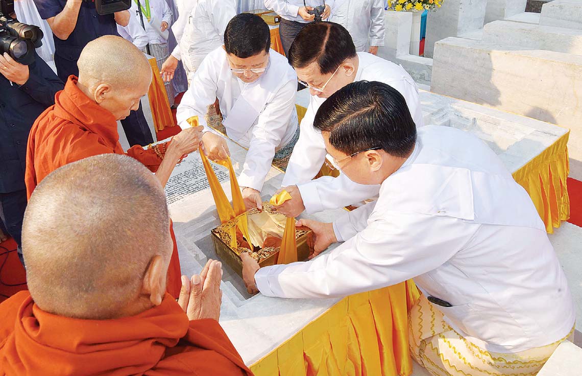 ယင်းနောက် ဦးဆောင်ဘုရားဒါယကာ နိုင်ငံတော်စီမံအုပ်ချုပ်ရေးကောင်စီဥက္ကဋ္ဌ နိုင်ငံတော်ဝန်ကြီးချုပ်နှင့် ဘုရားဒါယကာများက ဆရာတော်ကြီးများ ရွတ်ပွား သရဇ္စျာယ်တော်မူကြသည့် ဇယမင်္ဂလာဂါထာတော်ကို နာယူကြည်ညိုကြသည်။