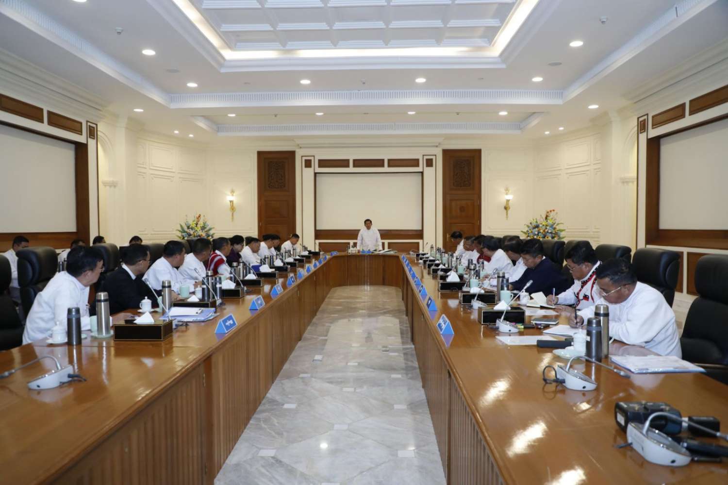 မိမိတို့အနေဖြင့် နိုင်ငံတော်စီမံအုပ်ချုပ်ရေးကောင်စီကို စတင်ဖွဲ့စည်းစဉ်ကတည်းကပင် နိုင်ငံစီးပွားရေးဖွံ့ဖြိုးတိုးတက်ရေးနှင့် ပြည်သူများ၏ လူမှုစီးပွားဘဝ ဖွံ့ဖြိုးတိုးတက်ရေးအတွက် ရှေ့လုပ်ငန်းစဉ်များ၊ ဦးတည်ချက်များချမှတ်၍ ၎င်းအပေါ်ဦးတည်ပြီး လုပ်ငန်းများကို စနစ်တကျအကောင်အထည်ဖော် ဆောင်ရွက်ခဲ့ခြင်းဖြစ်ကြောင်း၊ လက်ရှိအချိန်တွင်လည်း ရှေ့လုပ်ငန်းစဉ်များနှင့် ဦးတည်ချက်များကို အသစ်ထပ်မံချမှတ်ပြင်ဆင်၍ ဆောင်ရွက်လျက်ရှိပြီး ပထမအချက်အနေဖြင့် တည်ငြိမ်အေးချမ်းရေးအတွက် အချို့သောမြို့နယ်များတွင် စစ်အုပ်ချုပ်ရေးအမိန့်များကိုထုတ်ပြန်၍ တည်ငြိမ်အေးချမ်းရေးကို ဦးစားပေးဆောင်ရွက်လျက်ရှိကြောင်း၊ စစ်အုပ်ချုပ်ရေးအမိန့် ထုတ်ပြန်ခြင်းသည် ပြည်သူများကို ထိန်းချုပ်ကန့်သတ်ခြင်းမဟုတ်ဘဲ ဒေသခံပြည်သူလူထုတို့၏ အကျိုးစီးပွားကို ထိခိုက်ပျက်စီးအောင် ဆောင်ရွက်နေကြသည့် အကြမ်းဖက်သမားများ၏ လုပ်ဆောင်ချက်များကို ထိထိရောက်ရောက် ထိန်းချုပ်နိုင်ရေး ဆောင်ရွက်ခြင်းပင်ဖြစ်ကြောင်း၊ တည်ငြိမ်အေးချမ်းမှုကို အလေးထားဆောင်ရွက်ရန်လိုအပ်မည်ဖြစ်ပြီး လုံခြုံရေး၊ တည်ငြိမ်အေးချမ်းရေးနှင့် တရားဥပဒေစိုးမိုးရေးအတွက် တည်ငြိမ်မှုရှိရန် လိုအပ်သည့်ဒေသများတွင် ပိုမိုအလေးထား ဆောင်ရွက်သွားရန် မှာကြားလိုကြောင်း။