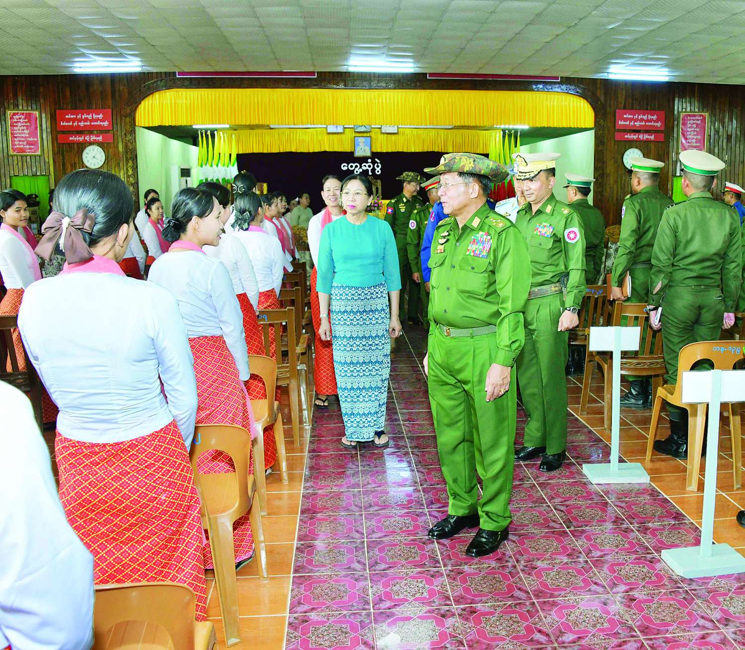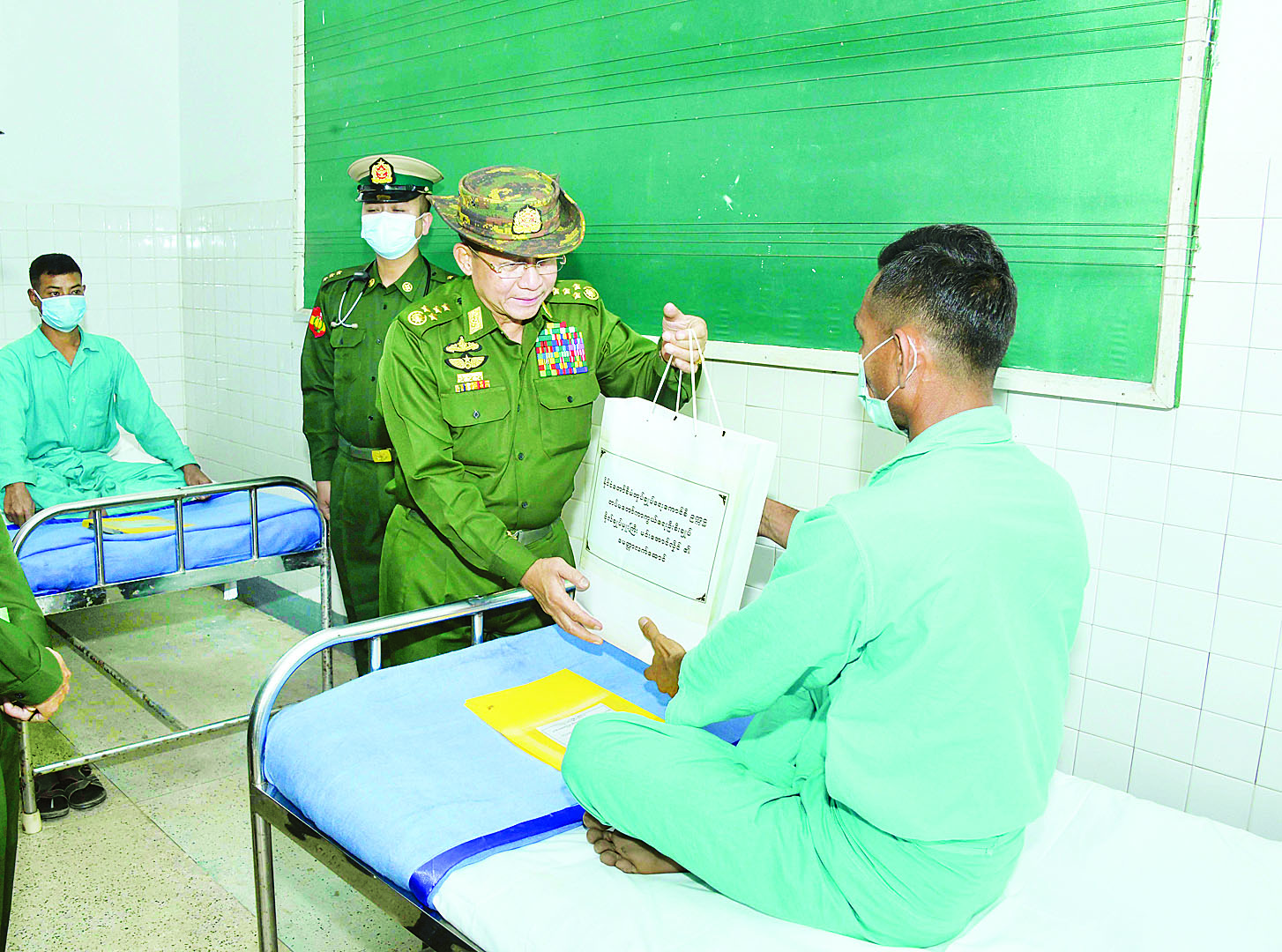 ထို့နောက် နိုင်ငံတော်စီမံအုပ်ချုပ်ရေးကောင်စီဥက္ကဋ္ဌ တပ်မတော်ကာကွယ်ရေးဦးစီးချုပ်၊ ဇနီးနှင့် အဖွဲ့ဝင်များသည် စစ်တွေမြို့ရှိ နယ်မြေခံတပ်မတော်ဆေးရုံသို့သွားရောက်၍ ဆေးရုံတက်ရောက်ကုသမှုခံယူလျက်ရှိသည့် အရာရှိ၊ စစ်သည်၊ မိသားစုဝင်များ၏ ကျန်းမာရေးအခြေအနေများကို တစ်ဦးချင်းရင်းရင်းနှီးနှီးမေးမြန်းအားပေး စကားပြောကြားကာ စားသောက်ဖွယ်ရာပစ္စည်းများပေးအပ်ခဲ့ကြောင်း သတင်းရရှိသည်။