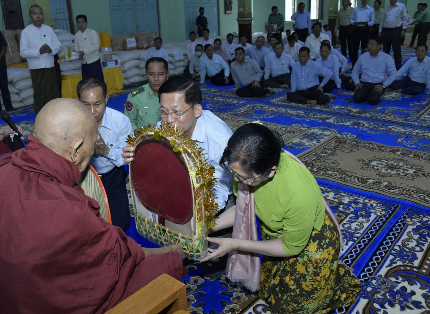 ထို့နောက် နိုင်ငံတော်စီမံအုပ်ချုပ်ရေးကောင်စီဥက္ကဋ္ဌ နိုင်ငံတော်ဝန်ကြီးချုပ်နှင့်ဇနီးတို့သည် မဟာဝိဇ္ဇာသိပ္ပံကျောင်းတိုက်ဆရာတော်၊ ရန်ကင်းကျောင်းတိုက်ဆရာတော်နှင့် ဓမ္မပါရဂူကျောင်းတိုက်ဆရာတော်တို့ထံ လှူဖွယ်ဝတ္ထုပစ္စည်းများ၊ နဝကမ္မအလှူငွေများ၊ ဆန်၊ ဆီ၊ ဆားနှင့်ပဲများကို ဆက်ကပ်လှူဒါန်းသည်။