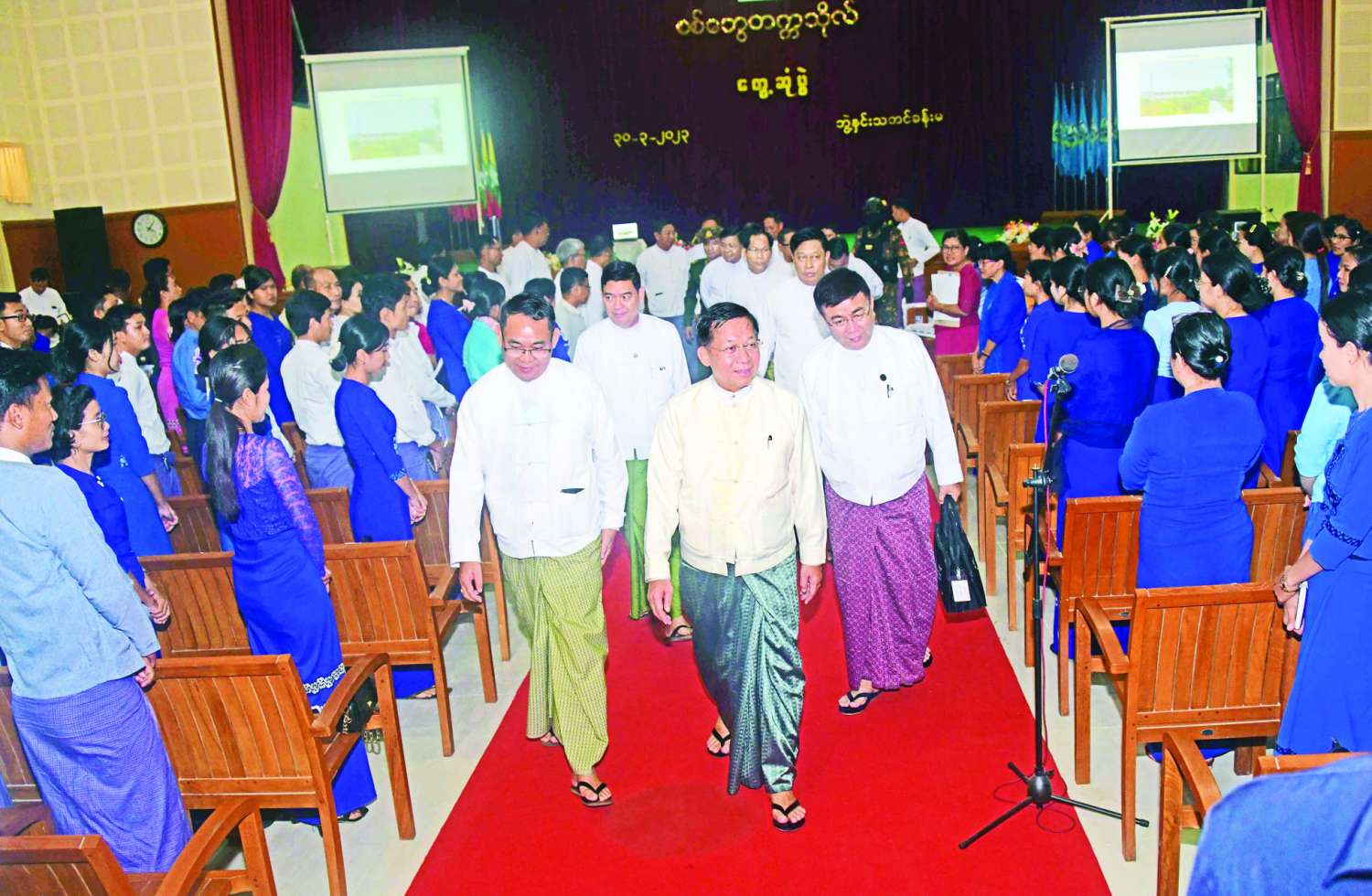 ကျောင်းသား ကျောင်းသူများအနက် ဘာသာရပ်များအလိုက် ထူးချွန်သူများအနေဖြင့် အဆင့်မြင့်သော ပညာသင်ကြားမှုများကို ဆက်လက်ဆောင်ရွက်နိုင် မည်ဖြစ်ကြောင်း၊ မိမိတို့နိုင်ငံသည် ဒီမိုကရေစီ လမ်းကြောင်းကို လျှောက်လှမ်းနေခြင်း ဖြစ်သော်လည်း ဒီမိုကရေစီ၏အခြေခံဖြစ်သည့် ဥပဒေအား လေးစားလိုက်နာခြင်းနှင့် စီးပွားရေးဖွံ့ဖြိုးတိုးတက်မှုအတွက် စီးပွားရေးအသိအမြင်ရှိခြင်းတို့၌ အားနည်း ချက်များရှိကြောင်း၊ ကျောင်းသား ကျောင်းသူများအနေဖြင့် ဥပဒေဆိုင်ရာများနှင့် စီးပွားရေးဆိုင်ရာ များကို သိရှိနိုင်ရန်လိုကြောင်း၊ ထို့ကြောင့် ဥပဒေပညာရပ်ကို နားလည်သိရှိစေရေး တက္ကသိုလ်အားလုံး တွင် ဥပဒေပညာရပ်ကို သင်ကြားပေးလျက်ရှိကြောင်း၊ အလားတူ စီးပွားရေးနှင့်ပတ်သက်သည့် အသိအမြင်များ ရှိစေရေးအတွက်လည်း စီးပွားရေးအခြေခံ ဘာသာရပ်များကို သင်ကြားပေးလျက်ရှိကြောင်း၊ မိမိတို့၏ မျှော်မှန်းချက်မှာ တက္ကသိုလ်ပညာ သင်ကြားပြီး ဘွဲ့ရရှိပြီးသူများအနေဖြင့် ၎င်းတို့၏လူမှုစီးပွားဘဝနှင့် ပတ်ဝန်းကျင်ကို ကောင်းမွန်အောင် ဆောင်ရွက်နိုင်သူများဖြစ်ရန်အတွက် မျှော်မှန်း ဆောင်ရွက်နေခြင်းဖြစ်ကြောင်း၊ ထို့ကြောင့် ဆရာ ဆရာမများအနေဖြင့်လည်း ကျောင်းသား ကျောင်းသူများ ပညာတတ်မြောက်စေရေးနှင့် ၎င်းတို့၏ဘဝ တစ်လျှောက် ကောင်းမွန်မှန်ကန်စွာ လျှောက်လှမ်းနိုင်ရေး ကြိုးပမ်းဆောင်ရွက်ပေးကြစေလိုကြောင်း။