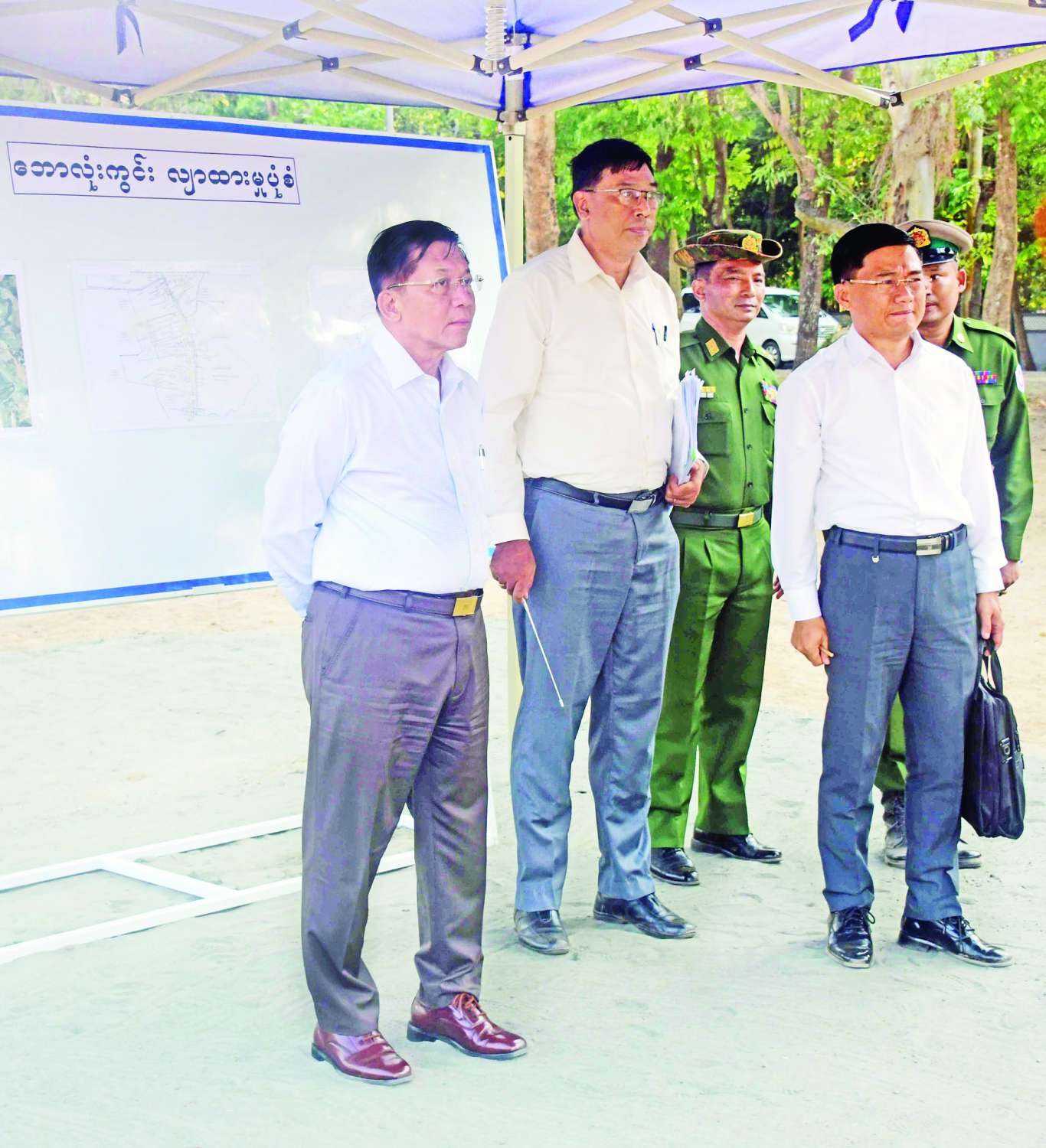 ထို့နောက် နိုင်ငံတော်စီမံအုပ်ချုပ်ရေးကောင်စီဥက္ကဋ္ဌ နိုင်ငံတော်ဝန်ကြီးချုပ်နှင့် အဖွဲ့ဝင်များသည် စစ်တွေမြို့ ရှုခင်းသာလမ်းတစ်လျှောက်တွင် ပြည်သူများ အနားယူအပန်းဖြေနိုင်ရန်အတွက် ကမ်းခြေတစ်လျှောက် သဲဖို့ခြင်းလုပ်ငန်းများဆောင်ရွက်ရန် စီမံဆောင်ရွက်မည့်အခြေအနေများကို သွားရောက်ကြည့်ရှုစစ်ဆေးပြီး တာဝန်ရှိသူများ၏ တင်ပြချက်များအပေါ် လိုအပ်သည်များ လမ်းညွှန်မှာကြားခဲ့ကြောင်း သတင်းရရှိသည်။
