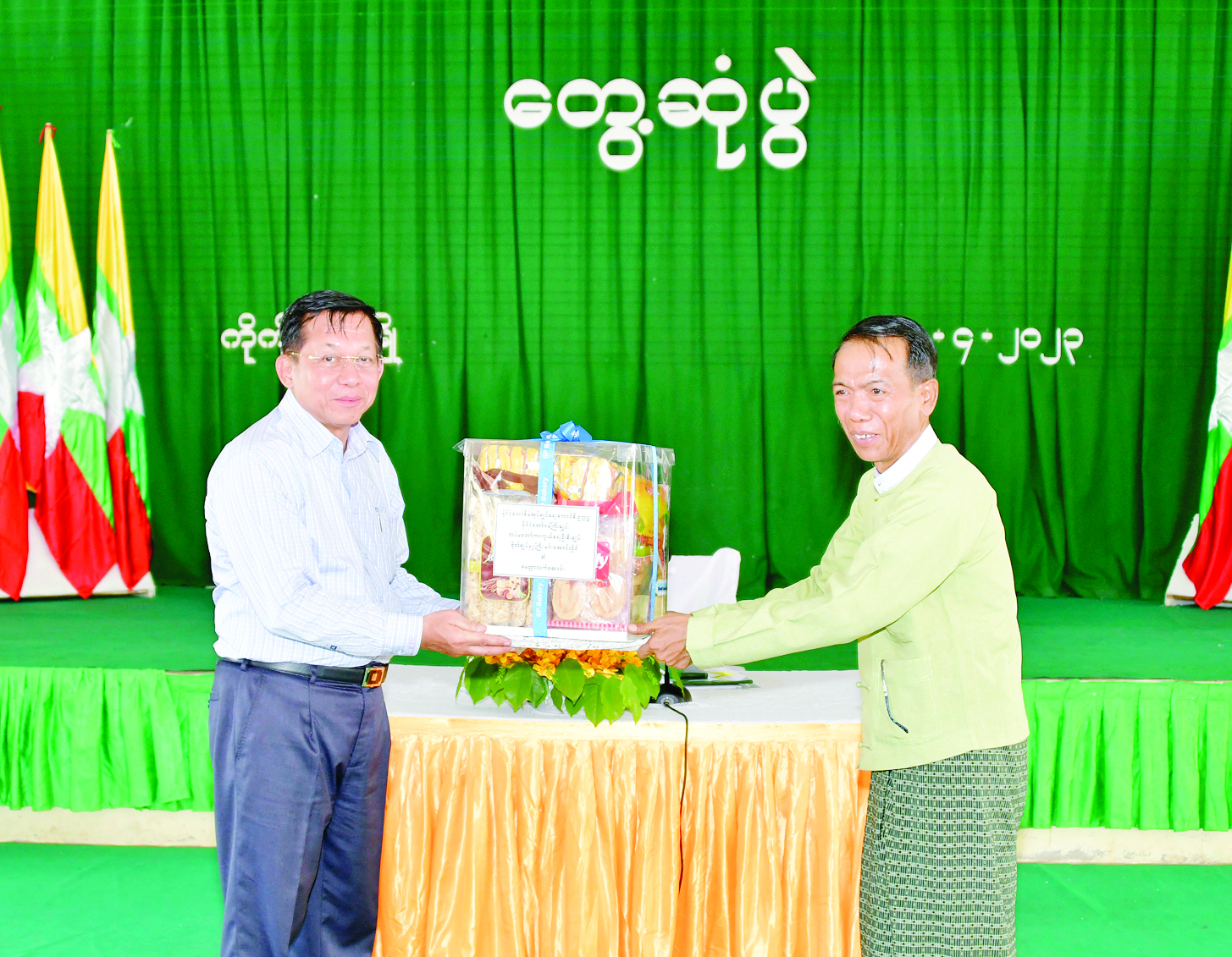 ထို့နောက် နိုင်ငံတော်စီမံအုပ်ချုပ်ရေးကောင်စီဥက္ကဋ္ဌ နိုင်ငံတော်ဝန်ကြီးချုပ်က ကိုကိုးကျွန်းမြို့ရှိ ဌာနဆိုင်ရာဝန်ထမ်းများအတွက် စားသောက်ဖွယ်ရာပေးအပ်ရာ မြို့နယ်စီမံအုပ်ချုပ်ရေးကောင်စီဥက္ကဋ္ဌ ဦးဆန်းမင်းက လက်ခံရယူသည်။
