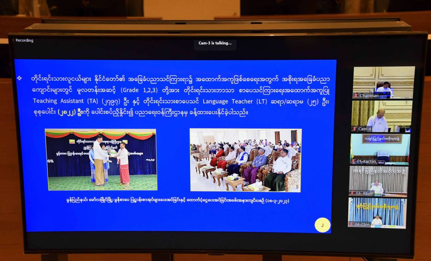 နိုင်ငံတွင် ဖွံ့ဖြိုးတိုးတက်ရေးအတွက် အဓိကကျသည်မှာ ပညာရည်မြင့်မားမှုဖြစ်ပါကြောင်း၊ ၁၉၉၉ ခုနှစ်က ၂၀၁၄ ခုနှစ်အထိ ပြည်ထောင်စုတစ်ခုလုံး ကျောင်းစတက်ခဲ့ကြသည့် လူငယ်ပေါင်း ၁၉,၄၄၁,၇၁၁ ဦးရှိရာတွင် အလယ်တန်းအဆင့် (၅)တန်းတက်ရောက်သူ ၁၁,၁၃၇,၃၁၈ ဦးဖြစ်သဖြင့် တက်ရောက်ရာခိုင်နှုန်း ၅၇.၂၉ ရာခိုင်နှုန်း၊ လျော့နည်းရာခိုင်နှုန်း ၄၂.၇၁ ရာခိုင်နှုန်းရှိပါကြောင်း၊ (၈)တန်းအထိ တက်ရောက်ပညာသင်ကြားသူ ၇,၇၈၇,၄၁၂ ဦး၊ တက်ရောက်ရာခိုင်နှုန်း ၄၀.၀၆ ရာခိုင်နှုန်းဖြင့် လျော့နည်းရာခိုင်နှုန်း ၅၉.၉၄ ရာခိုင်နှုန်းရှိပါကြောင်း၊ ၆၀ ရာခိုင်နှုန်းခန့်ဖြစ်ပါကြောင်း၊ ထို့အထဲတွင် ကချင်ပြည်နယ်မှ (၅)တန်းတက်ရောက်သူ ၇၆.၈၁ ရာခိုင်နှုန်း၊ (၈)တန်း တက်ရောက်သူ ၅၈.၁၁ ရာခိုင် နှုန်း၊ ကယားပြည်နယ်မှ (၅)တန်း တက်ရောက်သူ ၇၃.၆ ရာခိုင်နှုန်း၊ (၈)တန်း တက်ရောက်သူ ၄၈.၂၉ ရာခိုင်နှုန်း၊ ကရင်ပြည်နယ်မှ (၅)တန်း တက်ရောက်သူ ၅၃.၅၃ ရာခိုင်နှုန်း၊ (၈)တန်း တက်ရောက်သူ ၃၁.၁ ရာခိုင်နှုန်း၊ ချင်းပြည်နယ်မှ (၅)တန်းတက်ရောက်သူ ၅၇.၉၃ ရာခိုင်နှုန်း၊ (၈)တန်း တက်ရောက်သူ ၃၇.၄၅ ရာခိုင်နှုန်း၊ မွန်ပြည်နယ်မှ (၅)တန်း တက်ရောက်သူ ၅၉.၅ ရာခိုင်နှုန်း၊ (၈)တန်း တက်ရောက်သူ ၃၇.၈ ရာခိုင်နှုန်း၊ ရခိုင်ပြည်နယ်မှ (၅)တန်း တက်ရောက်သူ ၄၁.၅၅ ရာခိုင်နှုန်း၊ (၈)တန်း တက်ရောက်သူ ၂၉.၇၇ ရာခိုင်နှုန်း၊ ရှမ်းပြည်နယ်မှ (၅)တန်း တက်ရောက်သူ ၄၈.၂၈ ရာခိုင်နှုန်း၊ (၈)တန်း တက်ရောက်သူ ၃၀.၉ ရာခိုင်နှုန်း၊ တနင်္သာရီတိုင်းဒေသကြီးမှ (၅)တန်း တက်ရောက်သူ ၅၆.၂ ရာခိုင်နှုန်း၊ (၈)တန်း တက်ရောက်သူ ၃၁.၃၃ ရာခိုင်နှုန်းအသီးသီးရှိခဲ့ပါကြောင်း၊ အဆိုပါအချက်အလက်များအရ နယ်စပ်ဒေသပညာရေးမြှင့်တင်မှုသည် ထိုထက်ပိုမိုဆောင်ရွက်ရန်လိုပါကြောင်း၊ မိမိတို့အစိုးရ၏ ပညာရေးမျှော်မှန်းချက်သည် ကျောင်းနေ အရွယ်အားလုံး အနိမ့်ဆုံး KG+9 အောင်မြင်ရေးဖြစ်သည့်အတွက် တိုင်းရင်းသားအားလုံး ပညာရည်မြင့်မားရေး အလေးထားဆောင်ရွက်ရန် မှာကြားလိုပါကြောင်း။