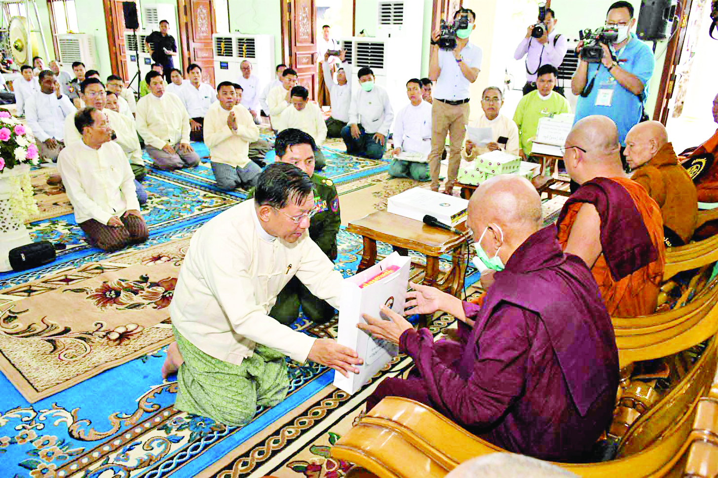 ယင်းနောက် နိုင်ငံတော်စီမံအုပ်ချုပ်ရေးကောင်စီဥက္ကဋ္ဌ နိုင်ငံတော်ဝန်ကြီးချုပ်နှင့်အဖွဲ့ဝင်များသည် မစိုးရိမ်တိုက်သစ်ပဓာနနာယက ဆရာတော်ထံမှအနုမောဒနာတရားကိုနာယူကာ လှူဒါန်းမှုအစုစုအတွက် ရေစက်သွန်းချအမျှပေးဝေကြသည်။