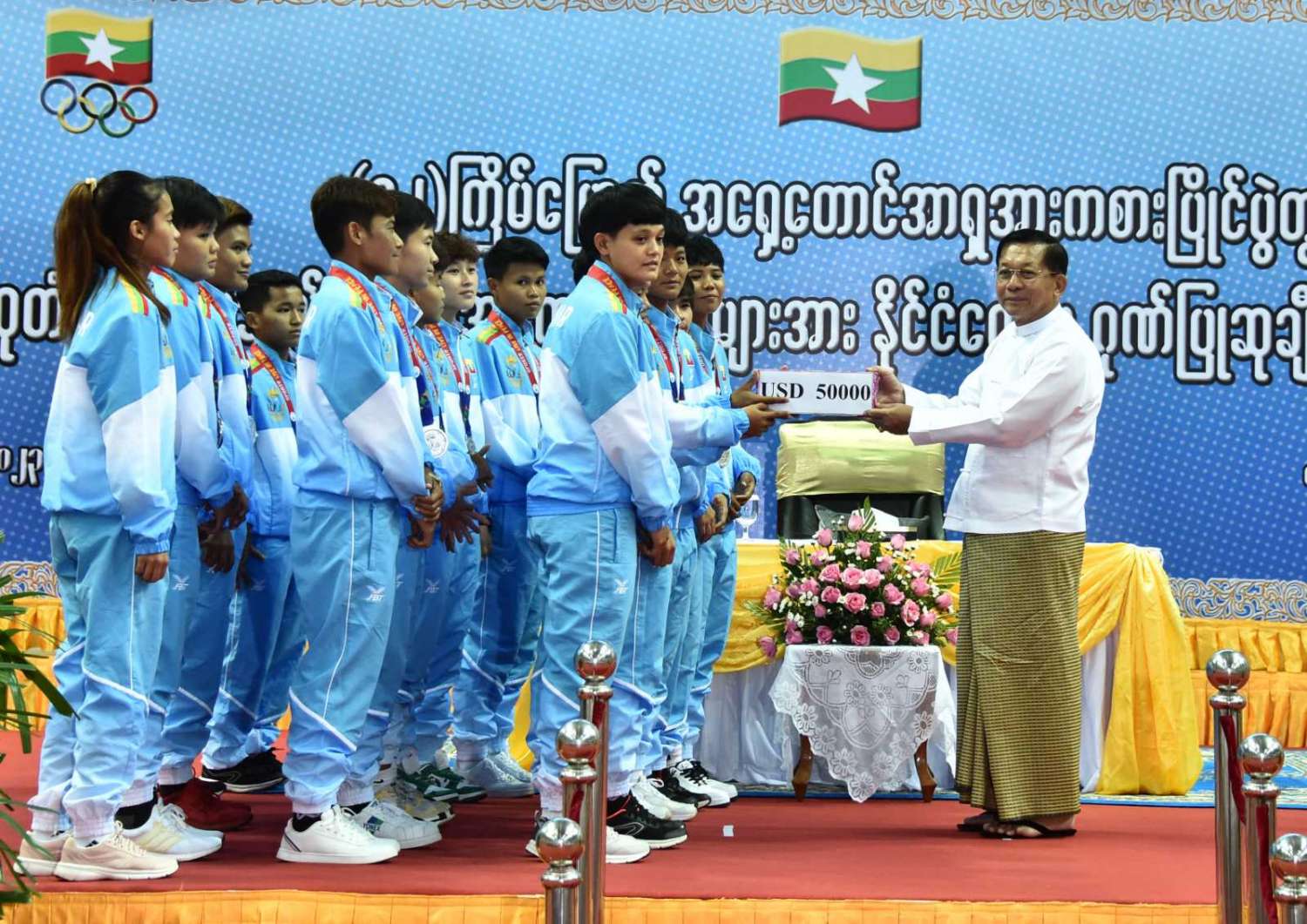 ကမ္ဘောဒီးယားနိုင်ငံ၌ ကျင်းပပြုလုပ်သည့် (၃၂)ကြိမ်မြောက် အရှေ့တောင်အာရှ အားကစားပြိုင်ပွဲသို့ မြန်မာနိုင်ငံကိုယ်စားပြု အားကစားသမားများအနေဖြင့် ဝင်ရောက်ယှဉ်ပြိုင်ခဲ့ကြသည့် အားကစားနည်း ၁၉ နည်းမှ ဗိုဗီနမ်၊ ဗိုဗီနမ် (ခွန်ဘိုကာတာ)၊ ဗိုဗီနမ် (အားနစ်)၊ ပိုက်ကျော်ခြင်း၊ ဘိလိယက်နှင့် စနူကာ၊ ပီတန်း၊ ဝူရှူး၊ တိုက်ကွမ်ဒို၊ ရိုးရာလှေ၊ အလေးမ အားကစားနည်း ရှစ်နည်း၌ ရွှေတံဆိပ် ၂၁ ခု ရရှိခဲ့ကြောင်း၊ ကျန်အားကစား ၁၁ နည်းအနက် ဘော်လီဘောနှင့် တင်းနစ်အားကစားနည်းများမှလွဲပြီး ကျန်အားကစားနည်း ကိုးနည်းမှာ ငွေတံဆိပ် ၂၅ ခုနှင့် ကြေးတံဆိပ် ၆၈ ခုရရှိခဲ့ကြောင်း၊ ငွေတံဆိပ်ရရှိခဲ့ကြသည့် အားကစားနည်းများသည်လည်း ပြိုင်ပွဲများ၌ ဗိုလ်လုပွဲကို တက်ရောက်နိုင်ခဲ့ခြင်းဖြစ်ပြီး ရွှေတံဆိပ်မရရှိခဲ့ကြသော်လည်း နိုင်ငံအတွက် နောက်ဆုံးဗိုလ်လုပွဲအဆင့်အထိ အကောင်းဆုံး ကြိုးစားယှဉ်ပြိုင်သွားခဲ့ကြကြောင်း၊ မြန်မာအမျိုးသမီးဘောလုံးအသင်းအနေဖြင့် ဗိုလ်လုပွဲသို့ တက်ရောက်နိုင်ခဲ့ပြီး အမျိုးသားဘောလုံးအသင်းအနေဖြင့်လည်း အကြိုဗိုလ်လုပွဲသို့ တက်ရောက်နိုင်ခဲ့ကြောင်း၊ နိုင်ငံတော်အနေဖြင့် နိုင်ငံ့ဂုဏ်ဆောင်နိုင်အောင် ပြင်းပြင်းထန်ထန် ကြိုးစားလေ့ကျင့်နေမှုများကို အသိအမှတ်ပြုသည့်အနေဖြင့် တာဝန်ရှိသူများက မကြာခဏ ကြည့်ရှုအားပေးခဲ့သကဲ့သို့ ယခုအခါတွင်လည်း ဆုတံဆိပ်ရရှိခဲ့ကြသူများကို ထိုက်တန်စွာဖြင့် ဂုဏ်ပြုချီးမြှင့်ငွေများပေးအပ်ခဲ့ရာ တစ်ဦးချင်းပြိုင်ပွဲများ၌ ရွှေတံဆိပ်ရရှိခဲ့သူများကို ငွေကျပ်သိန်း ၃၀၀၊ ငွေတံဆိပ်ရရှိခဲ့သူများကို ငွေကျပ်သိန်း ၂၀၀၊ ကြေးတံဆိပ်ရရှိခဲ့သူများကို ငွေကျပ်သိန်း ၁၀၀၊ အသင်းလိုက်ပြိုင်ပွဲများ၌ ရွှေတံဆိပ်ရရှိခဲ့ကြသည့် အသင်းသား တစ်ဦးလျှင် ငွေကျပ်သိန်း ၁၀၀၊ ငွေတံဆိပ်ရရှိခဲ့ကြသည့် အသင်းသားတစ်ဦးလျှင် ငွေကျပ်သိန်း ၇၀၊ ကြေးတံဆိပ် ရရှိခဲ့ကြသည့် အသင်းသားတစ်ဦးလျှင် ငွေကျပ် ၃၅ သိန်းနှင့် အားကစားနည်းအလိုက် တာဝန်ယူ ဆောင်ရွက်ခဲ့ကြသည့် နည်းပြများနှင့် အုပ်ချုပ်သူများအား မိမိတို့အားကစားနည်းမှ ရွှေတံဆိပ်ရရှိခဲ့ပါက တစ်ဦးလျှင် ငွေကျပ်သိန်း ၁၀၀၊ ငွေတံဆိပ်ရရှိခဲ့ပါက ငွေကျပ်သိန်း ၅၀၊ ကြေးတံဆိပ်ရရှိခဲ့ပါက ငွေကျပ်သိန်း ၃၀ စီ ပေးအပ်ချီးမြှင့်ခဲ့ရာ စုစုပေါင်းချီးမြှင့်ငွေအနေဖြင့် ငွေကျပ်စုစုပေါင်း ၃၃၃၃ သန်းနှင့် အမေရိကန် ဒေါ်လာ ၇ သောင်းဖြစ်ကြောင်း သတင်းရရှိသည်။