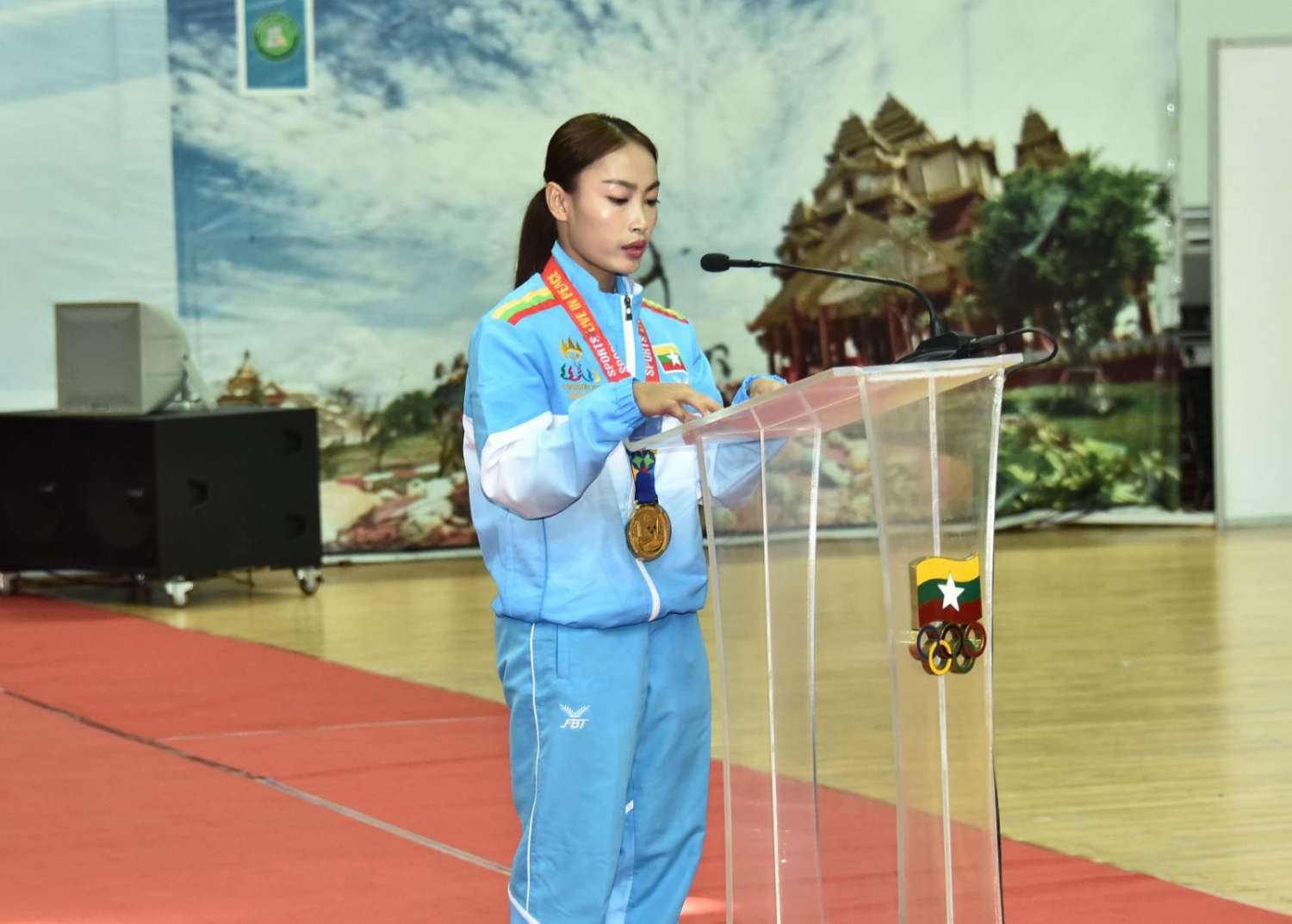 ယင်းနောက် နိုင်ငံ့ဂုဏ်ဆောင် ဆုတံဆိပ်ရ အားကစားသမားများကိုယ်စား ရွှေတံဆိပ်တစ်ခု၊ ငွေတံဆိပ်နှစ်ခုရရှိသော ဝူရှူးအားကစားသမား မစန္ဒီဦးက ကျေးဇူးတင်စကား ပြန်လည်ပြောကြား သည်။
