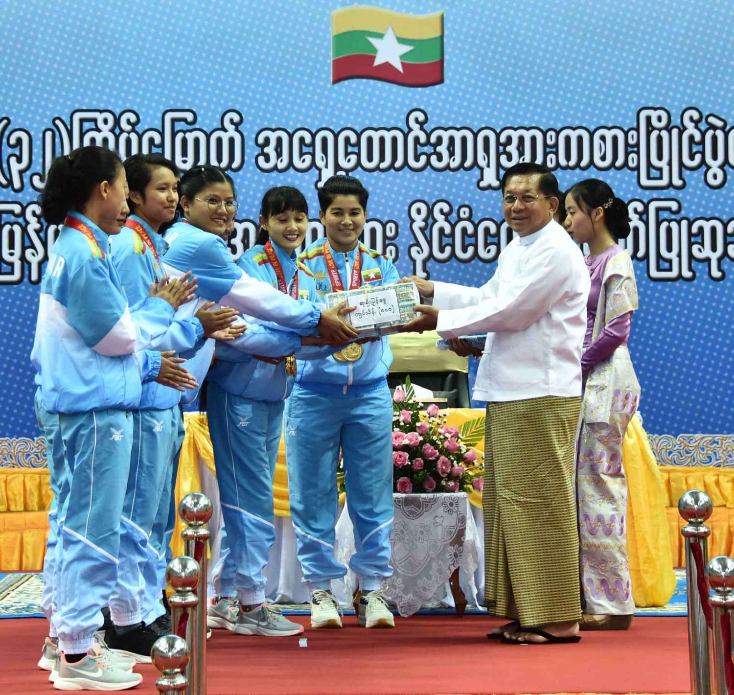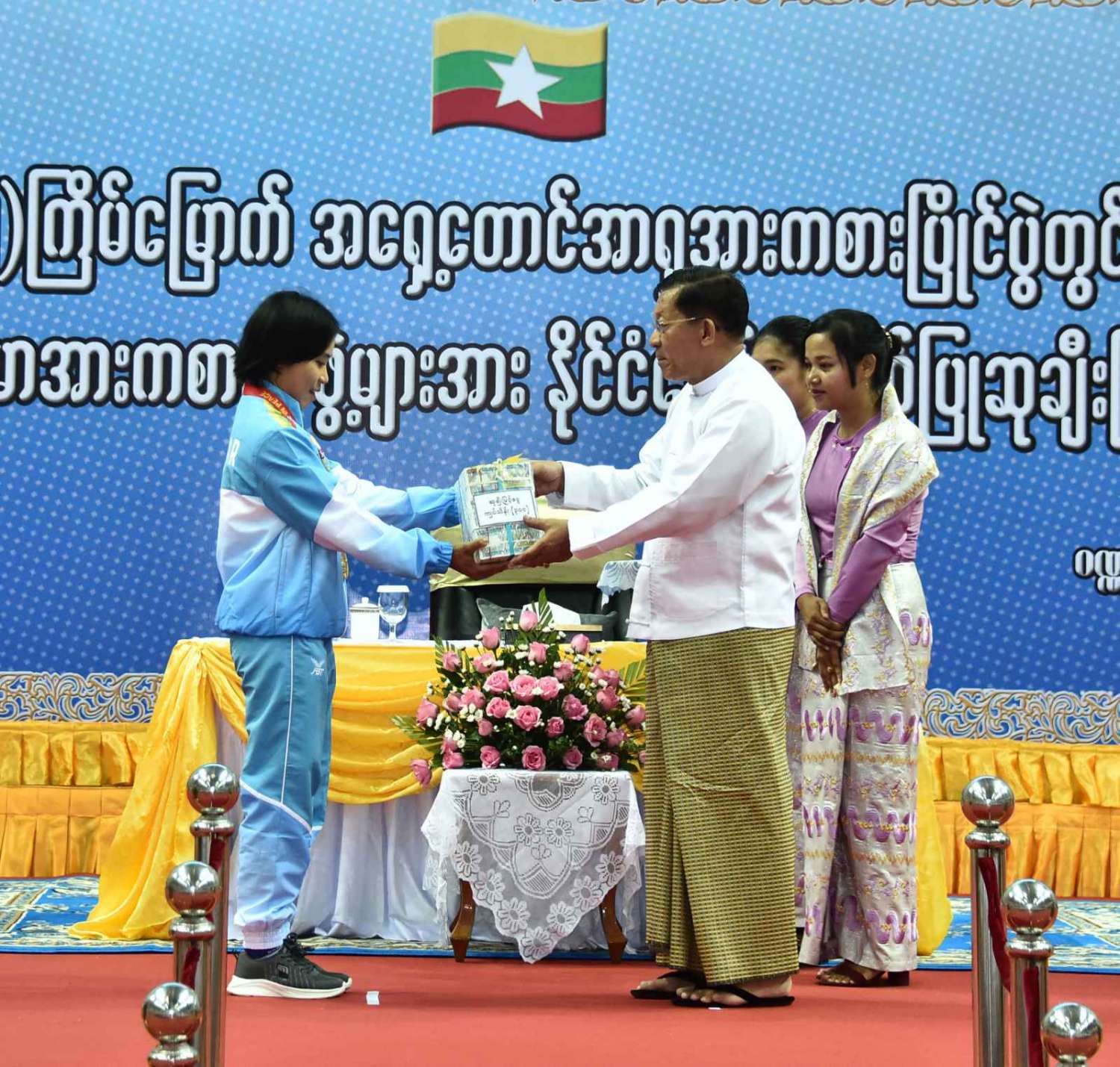 ထို့နောက် (၃၂)ကြိမ်မြောက် အရှေ့တောင်အာရှ အားကစားပြိုင်ပွဲတွင် ဆုတံဆိပ်ရရှိခဲ့သည့် နိုင်ငံ့ဂုဏ်ဆောင် ဆုရအားကစားသမားများ၊ နည်းပြများနှင့် အုပ်ချုပ်သူများကို ဂုဏ်ပြုဆုငွေများ ပေးအပ်ချီးမြှင့်ရာ နိုင်ငံတော်စီမံအုပ်ချုပ်ရေးကောင်စီဥက္ကဋ္ဌ နိုင်ငံတော်ဝန်ကြီးချုပ်က ရွှေတံဆိပ်ဆုရရှိခဲ့ကြသည့် ဗိုဗီနမ်အားကစားနည်းမှ မောင်အိုက်စိုးလင်း၊ မခိုင်ဝါဖူးနှင့် မမေဟန်နီအောင်လွင်၊ မောင်မနားကွီးနှင့် မောင်တင်ထူးဇော်၊ မောင်အောင်ခိုင်လင်း၊ မောင်ဟိန်းထက်အောင်၊ မောင်ကျော်သူစိုးအောင်၊ မောင်ရာဇာထွန်း၊ ဗိုဗီနမ် (ခွန်ဘိုကာတာ) ကစားနည်းမှ မောင်ပိုင်ဇေယျာဖြိုး၊ မောင်အံ့ဘွယ်ငြိမ်း၊ မနီလာစိုးဦး၊ ဗိုဗီနမ်(အားနစ်) ကစားနည်းမှ မောင်စည်သူမောင်၊ မောင်ဇော်သက်၊ မောင်ရဲဇော်မိုး၊ မောင်မျိုးထွန်းအံ့၊ ခြင်းလုံးအားကစားနည်းမှ Same Stroke Event-2 အမျိုးသမီးအသင်း၊ Linking (Preliminary) Event-3 အမျိုးသား၊ အမျိုးသမီးအသင်း၊ Non Repetition Secondary Event-4 အမျိုးသားအသင်း၊ Non Repetition Secondary Event-4 အမျိုးသမီးအသင်း၊ ပိုက်ကျော်ခြင်း အားကစားနည်း၊ ကွင်းသွင်းကစားနည်းမှ အမျိုးသားအသင်း၊ ကွင်းသွင်းခြင်းကစားနည်းမှ အမျိုးသမီးအသင်း၊ ဘိလိယက်/စနူကာ အားကစားနည်းမှ ဦးပေါက်စ၊ မောင်မောင် (ခ) ဘုန်းမြင့်ကျော် (ကိုယ်စား) အားကစားသမားတစ်ဦး၊ မောင်သော်ဇင်ထက်၊ ဝူရှူးအားကစားနည်းမှ မစန္ဒီဦး၊ ရိုးရာလှေ အသက် (၂၄) နှစ်အောက် အမျိုးသား ငါးယောက်လှော် မီတာ ၂၅၀ အားကစား အသင်း၊ တိုက်ကွမ်ဒို အားကစားနည်းမှ မောင်ကျော်မင်းနိုင်၊ အလေးမအားကစားနည်းမှ မဇင်မေဦး၊ ပီတန်းအားကစားနည်းမှ မခင်ချယ်ရီသက်တို့အား ဂုဏ်ပြုချီးမြှင့်ငွေများ ပေးအပ်ချီးမြှင့်သည်။