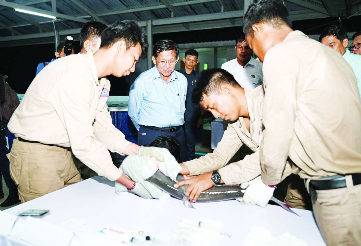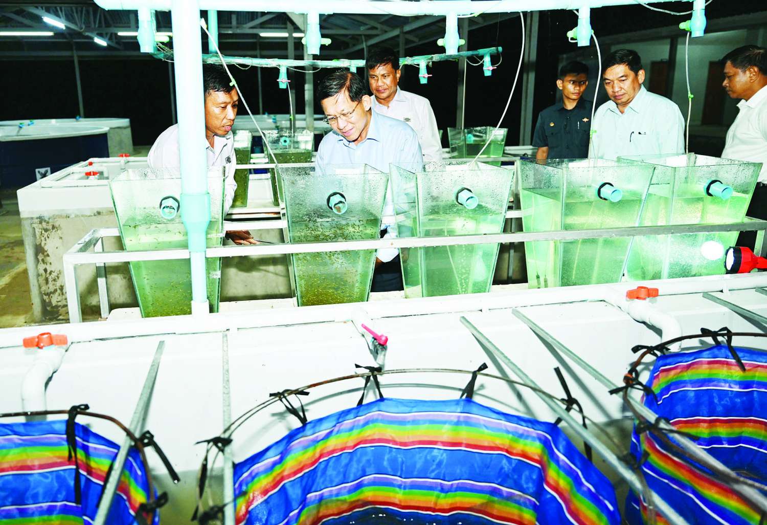 ယင်းနောက် နိုင်ငံတော်စီမံအုပ်ချုပ်ရေးကောင်စီဥက္ကဋ္ဌ နိုင်ငံတော်ဝန်ကြီးချုပ်သည် မွေးမြူရေးဇုန် အတွင်းရှိ ငါးသားဖောက်လုပ်ငန်းဆောင်ရွက်နေမှုနှင့် ငါးသား ပေါက်မွေးမြူထားရှိမှု အခြေအနေများအား လှည့်လည်ကြည့်ရှုစစ်ဆေးပြီး တာဝန်ရှိ သူများ၏ တင်ပြချက်များအပေါ် လိုအပ်သည်များ မှာကြားခဲ့ကြောင်း  သတင်းရရှိသည်။