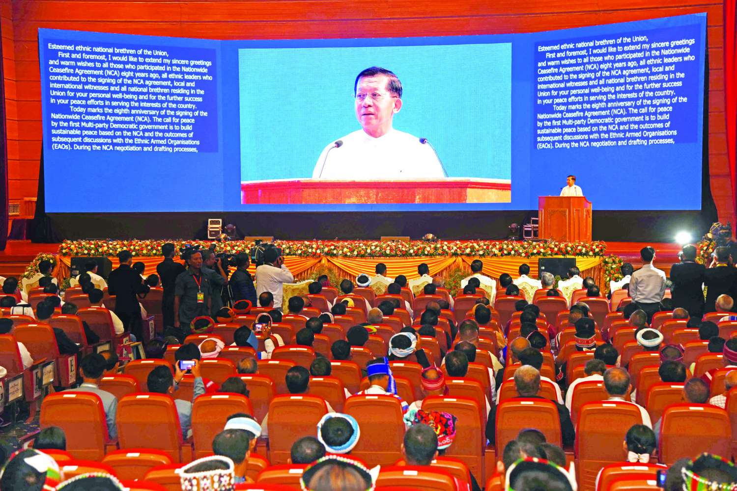 ထို့နောက် နိုင်ငံတော်စီမံအုပ်ချုပ်ရေးကောင်စီဥက္ကဋ္ဌ နိုင်ငံတော်ဝန်ကြီးချုပ် အမျိုးသားစည်းလုံးညီညွတ်ရေးနှင့် ငြိမ်းချမ်းရေးဖော်ဆောင်မှု ဗဟိုကော်မတီဥက္ကဋ္ဌ၊ နိုင်ငံတော်စီမံအုပ်ချုပ်ရေးကောင်စီ ဒုတိယဥက္ကဋ္ဌ ဒုတိယဝန်ကြီးချုပ်၊ ကောင်စီအတွင်းရေးမှူး၊ တွဲဖက်အတွင်းရေးမှူးနှင့် ကောင်စီအဖွဲ့ဝင်များသည် NCA-S-EAO တိုင်းရင်းသားလက်နက်ကိုင်အဖွဲ့အစည်းများမှ ပုဂ္ဂိုလ်များ၊ ဂုဏ်ထူးဆောင်ဘွဲ့ချီးမြှင့်ခံရသည့် ငြိမ်းချမ်းရေးအကျိုးတော်ဆောင်များ၊ အိမ်နီးချင်းနိုင်ငံများ၏ အထူးကိုယ်စားလှယ်များ၊ EAO အထောက်အကူပြုများနှင့်လည်းကောင်း၊ နိုင်ငံတော်စီမံအုပ်ချုပ်ရေးကောင်စီအဖွဲ့ဝင်များ၊ ပြည်ထောင်စုဝန်ကြီးများ၊ မြန်မာနိုင်ငံအခြေစိုက်သံရုံးများမှ သံတမန်များနှင့်လည်းကောင်း၊ နိုင်ငံရေးပါတီများမှဥက္ကဋ္ဌများနှင့် ကိုယ်စားလှယ်များ၊ အစိုးရဘက်မှ NCA လက်မှတ်ရေးထိုးထားသူများ၊ ပြည်တွင်းအသိသက်သေများ၊ ငြိမ်းချမ်းရေးလုပ်ငန်းစဉ်များတွင် ပါဝင်ဆောင်ရွက်ခဲ့သူများနှင့်လည်းကောင်း၊ ပြည်ထောင်စုအဆင့်အဖွဲ့အစည်းများ၊ ကော်မတီ၊ ကော်မရှင်များမှပုဂ္ဂိုလ်များ၊ တပ်မတော်အရာရှိကြီးများ၊ အမျိုးသားစည်းလုံးညီညွတ်ရေးနှင့် ငြိမ်းချမ်းရေးဖော်ဆောင်မှုလုပ်ငန်းကော်မတီနှင့် ညှိနှိုင်းရေးကော်မတီတို့မှ ကော်မတီဝင်များ၊ နိုင်ငံတော်စီမံအုပ်ချုပ်ရေးကောင်စီ ဗဟိုအကြံပေးအဖွဲ့ဝင်များ၊ နိုင်ငံတော်စီမံအုပ်ချုပ်ရေးကောင်စီဥက္ကဋ္ဌ၏ အကြံပေးအဖွဲ့ဝင်များနှင့်လည်းကောင်း စုပေါင်းမှတ်တမ်းတင် ဓာတ်ပုံရိုက်ကြသည်။
