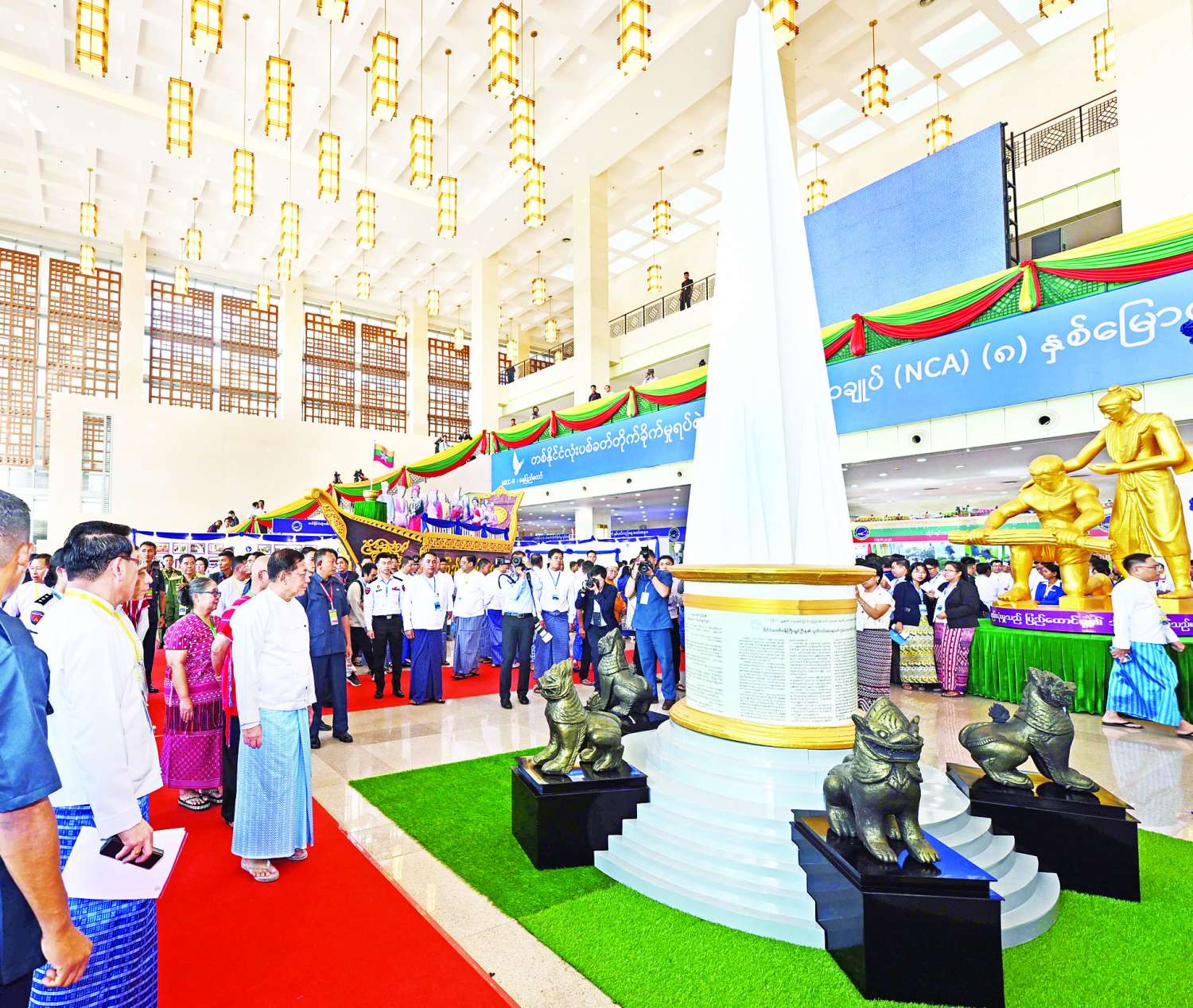 ထို့နောက် နိုင်ငံတော်စီမံအုပ်ချုပ်ရေးကောင်စီဥက္ကဋ္ဌ နိုင်ငံတော်ဝန်ကြီးချုပ် အမျိုးသားစည်းလုံးညီညွတ်ရေးနှင့် ငြိမ်းချမ်းရေးဖော်ဆောင်မှုဗဟိုကော်မတီဥက္ကဋ္ဌနှင့် အခမ်းအနားသို့တက်ရောက်လာသည့် ဧည့်သည်တော်များသည် (MICC-II) Lobby ၌ ခင်းကျင်းပြသထားသည့် တစ်နိုင်ငံလုံးပစ်ခတ်တိုက်ခိုက်မှုရပ်စဲရေးသဘောတူစာချုပ် (NCA) (၈) နှစ်မြောက် နှစ်ပတ်လည်နေ့ အထိမ်းအမှတ် သတင်းစာများကပြောသောငြိမ်းချမ်းရေးသမိုင်း မှတ်တမ်းပြခန်း၊ ငြိမ်းချမ်းရေးကြိုးပမ်းမှုမှတ်တမ်းဓာတ်ပုံများ ပြခန်း၊ နယ်စပ်ရေးရာဝန်ကြီးဌာန ပြခန်း၊ တိုင်းရင်းသားလူမျိုးရေးရာဝန်ကြီးဌာန ပြခန်း၊ မြန်မာ့အသံနှင့်ရုပ်မြင်သံကြား၏ တိုင်းရင်းသားလူမျိုးများရုပ်သံလိုင်းနှင့် မြန်မာ့အသံရေဒီယိုတို့မှ တိုင်းရင်းသားဘာသာများဖြင့် ထုတ်လွှင့်မှု သရုပ်ပြပြခန်း၊ ပြည်ထောင်စုအလှ ထာဝရမှတ်တမ်းဓာတ်ပုံများ ပြခန်းများကို လှည့်လည်ကြည့်ရှုကြသည်။