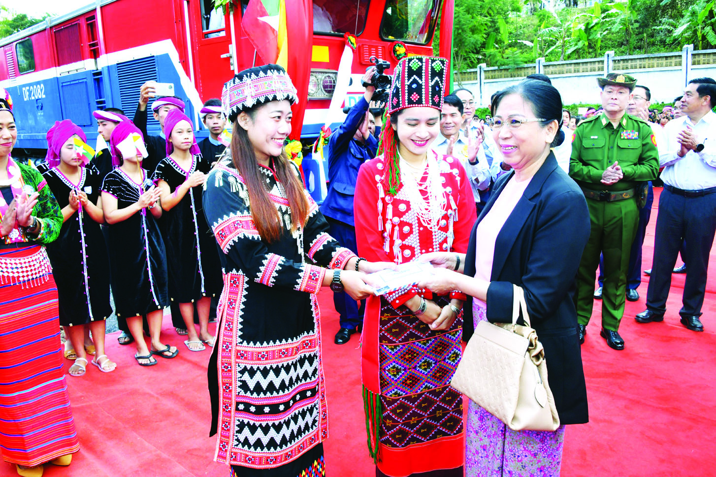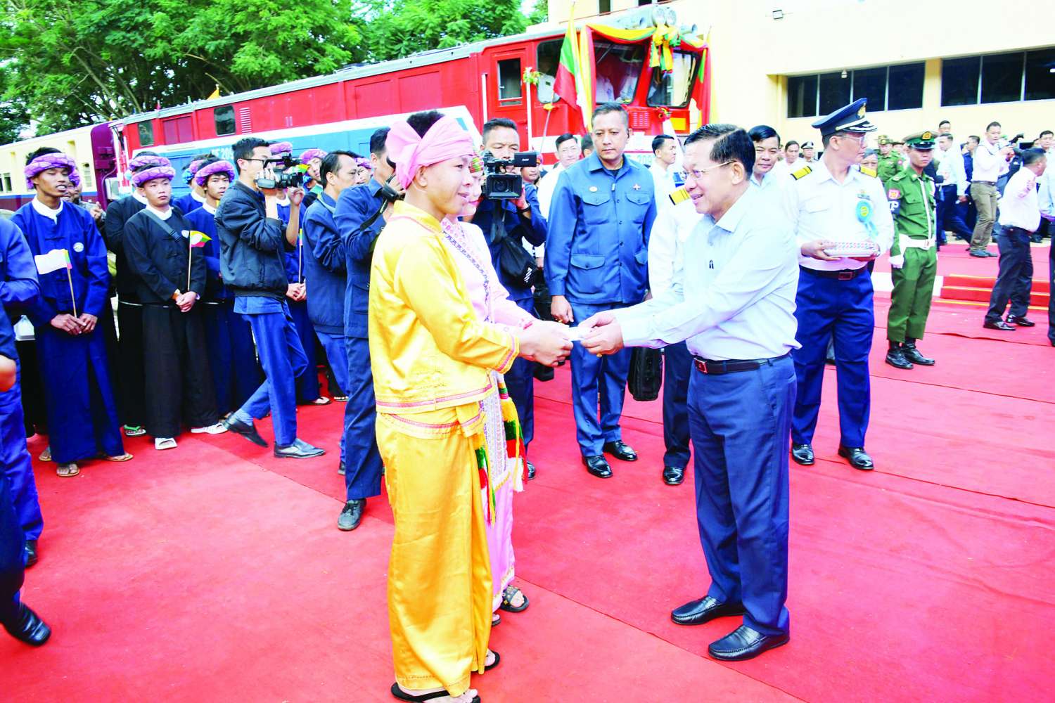 ဦးစွာ နိုင်ငံတော်စီမံအုပ်ချုပ်ရေးကောင်စီဥက္ကဋ္ဌ နိုင်ငံတော်ဝန်ကြီးချုပ်နှင့်ဇနီး၊ အခမ်းအနား တက်ရောက်လာကြသူများသည် အခမ်းအနားကျင်းပပြုလုပ်မည့် တောင်ကြီးဘူတာသို့ ရောက်ရှိကြရာ တာဝန်ရှိသူများနှင့် ဒေသခံတိုင်းရင်းသားပြည်သူတို့က လှိုက်လှဲနွေးထွေးစွာ ကြိုဆိုနှုတ်ဆက်ကြသည်။