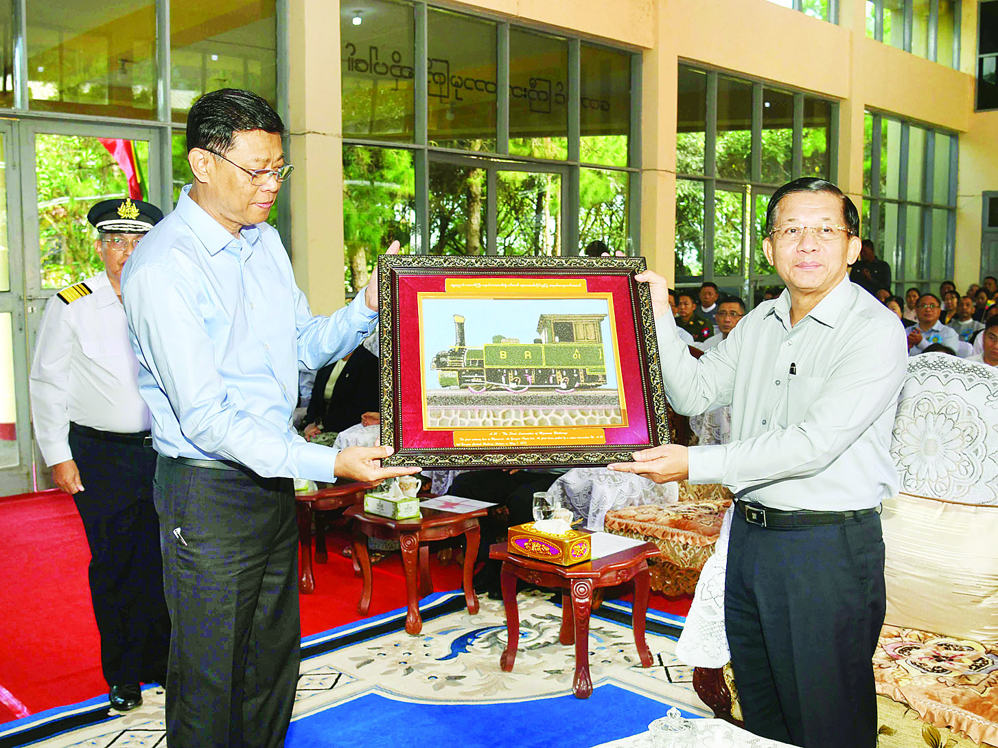 ထို့နောက် နိုင်ငံတော်စီမံအုပ်ချုပ်ရေးကောင်စီဥက္ကဋ္ဌ နိုင်ငံတော်ဝန်ကြီးချုပ်နှင့် ဇနီး ဦးဆောင်သည့်အဖွဲ့ဝင်များ၊ ဒေသခံတိုင်းရင်းသားပြည်သူများသည် တောင်ကြီးဘူတာမှ ပေါမူဘူတာသို့ ပြေးဆွဲထွက်ခွာမည့် ရထားတွဲဆိုင်းပေါ်တွင် အတူတကွ လိုက်ပါစီးနင်းခဲ့ကြပြီး တောင်ကြီးမြို့အား ရထားပေါ်မှ မြင်တွေ့ရသည့် အလှအပများ၊ တောင်ကြားလမ်းများ၊ ရထားလမ်းကြောင်းတစ်လျှောက် မြင်တွေ့ရသည့် သဘာဝရှုခင်းအလှအပများ၊ စိုက်ပျိုးရေး ဆောင်ရွက်ထားရှိမှုများ၊ ထီသိမ်ဘူတာအနီး၌ ထည့်သွင်း ဖောက်လုပ်ထားသည့် ရထားလမ်းအဝိုင်း ပတ်ကို ရှမ်းပြည်နယ်၏ ထင်ရှားသော ဘဝသံသရာရထားလမ်းနှင့် တံတားပုံစံအတိုင်း ထည့်သွင်းတည်ဆောက်ထားရှိမှုများ၊ ရထားလမ်းပိုင်းနေရာအချို့အား ကျောက်သားမြေနံရံများ၊ ကျောက်တောင်များကို ဖြတ်တောက်တူးဖော်၍ ကျောက်တောင်ကြား လမ်းပိုင်းရှည်နေရာများကို ခက်ခက်ခဲခဲ ကြိုးပမ်းဖောက်လုပ်ထားရှိမှုများကို ကြည့်ရှုခဲ့ကြပြီး လမ်းကြောင်းတစ်လျှောက်မှ ဒေသခံပြည်သူ များ၏ ရင်းရင်းနှီးနှီးနှုတ်ဆက်မှုကို လက်ဝှေ့ယမ်းပြ ပြန်လည်နှုတ်ဆက်သည်။