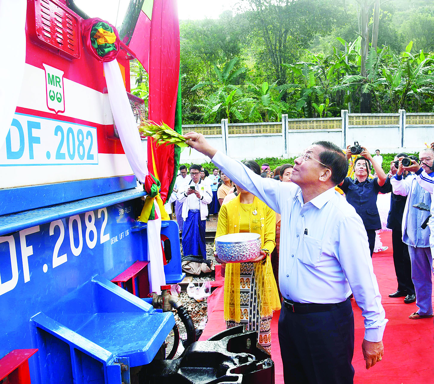 ၎င်းနောက် နိုင်ငံတော်စီမံအုပ်ချုပ်ရေးကောင်စီဥက္ကဋ္ဌ နိုင်ငံတော်ဝန်ကြီးချုပ်နှင့် အဖွဲ့ဝင်များသည် တောင်ကြီးဘူတာမှ ပင်းပက်ဘူတာသို့ ပြေးဆွဲထွက်ခွာမည့် ရထားစက်ခေါင်းနှင့် တောင်ကြီးဘူတာမှ ပေါမူဘူတာသို့ ပြေးဆွဲထွက်ခွာမည့် ရထားစက်ခေါင်းတို့အား အမွှေးနံ့သာရည် များဖြင့် ပက်ဖျန်းပေးကြသည်။