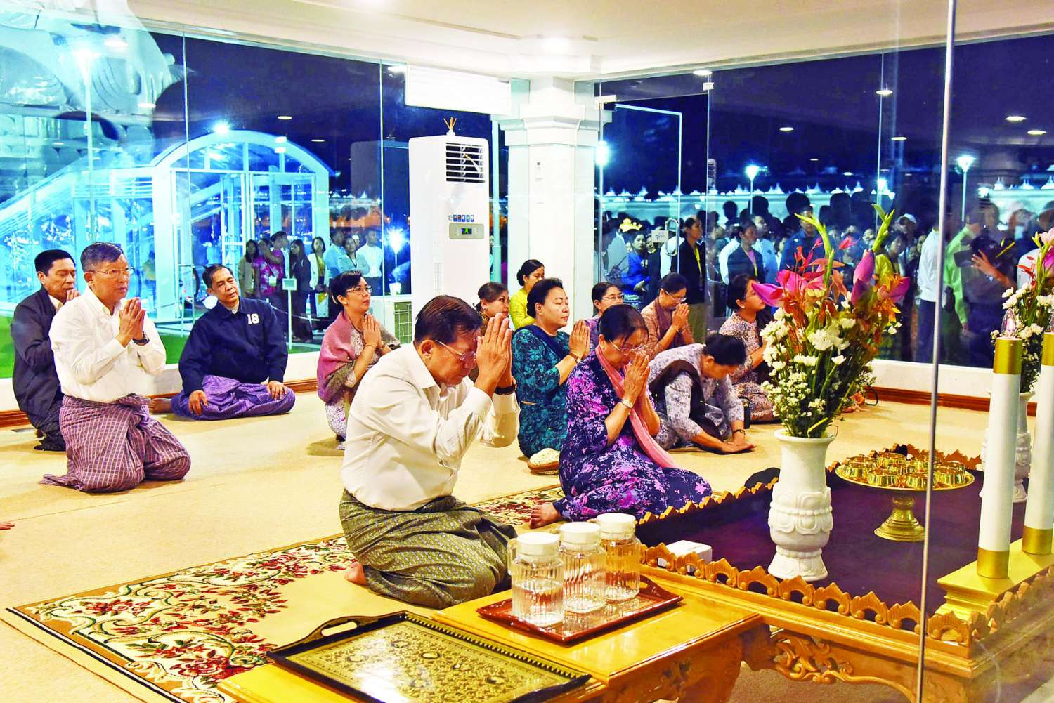 ပြည်ထောင်စုနယ်မြေ နေပြည်တော် ဒက္ခိဏသီရိမြို့နယ်ရှိ မာရဝိဇယဗုဒ္ဓရုပ်ပွားတော်မြတ်ကြီး တန်ဆောင်တိုင်မီးထွန်းပွဲတော် မီးပုံးပျံလွှတ်တင်ပူဇော်ခြင်းအခမ်းအနားကို နိုဝင်ဘာ ၂၅ ရက်မှစတင်၍ ကျင်းပပြုလုပ်လျက်ရှိပြီး ယနေ့တန်ဆောင်မုန်းလပြည့်နေ့ ညနေပိုင်းတွင် မာရဝိဇယဗုဒ္ဓဥယျာဉ်တော်အတွင်း၌ ဆက်လက်ကျင်းပပြုလုပ်ရာ နိုင်ငံတော်စီမံအုပ်ချုပ်ရေးကောင်စီဥက္ကဋ္ဌ နိုင်ငံတော်ဝန်ကြီးချုပ် ဗိုလ်ချုပ်မှူးကြီး မင်းအောင်လှိုင်နှင့် ဇနီး ဒေါ်ကြူကြူလှတို့ တက်ရောက်ကြည့်ရှုအားပေးကြသည်။