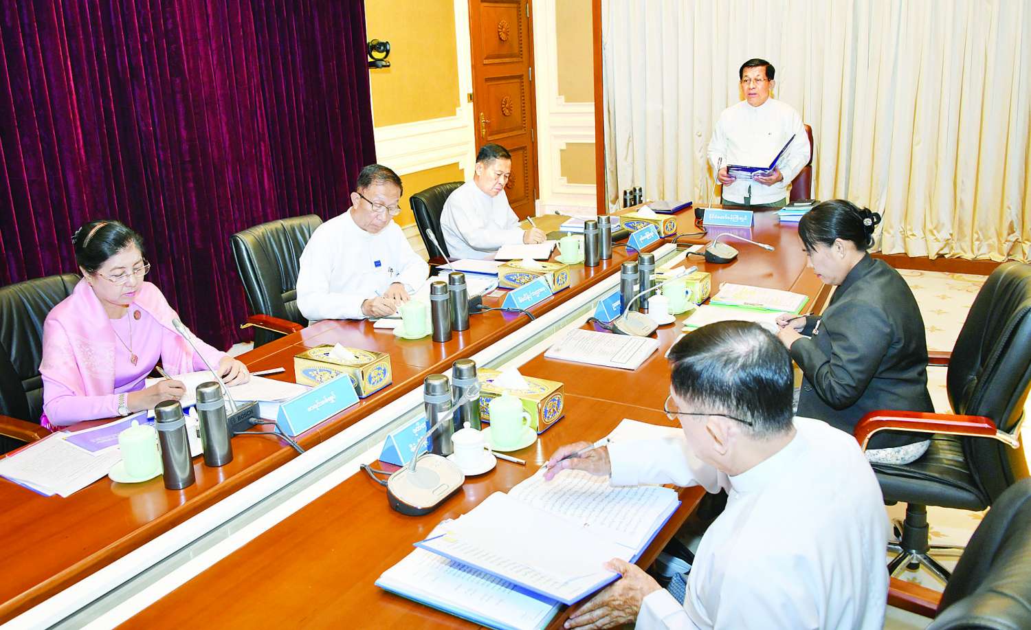 ကိုဗစ်-၁၉ ကပ်ရောဂါဘေး၊ ဆိုင်ကလုန်းမုန်တိုင်း မိုခါဘေးစသည့် သဘာဝဘေးများကြောင့် ထိခိုက်ခဲ့ရသည့် နိုင်ငံတော်၏ စီးပွားရေးအခြေအနေကို ပြန်လည်မြှင့်တင်နိုင်ရန် ကြိုးပမ်းဆောင်ရွက်ခဲ့ခြင်းကြောင့် ယခုအခါ ကုန်ထုတ်လုပ်မှုလုပ်ငန်းများ၊ ကုန်စည်ကူးသန်း ရောင်းဝယ်ရေးလုပ်ငန်းများ၊ ဝန်ဆောင်မှုလုပ်ငန်းများ ပြန်လည်ဖွံ့ဖြိုးတိုးတက်လာသည်ကို တွေ့ကြရကြောင်း၊ ထို့ကြောင့် ပြည်ထောင်စုဝန်ကြီးဌာနများနှင့် တိုင်းဒေသကြီးနှင့် ပြည်နယ်အစိုးရအဖွဲ့များအနေဖြင့် နိုင်ငံတော်၏ စီးပွားရေးအခြေအနေ ဖွံ့ဖြိုးတိုးတက်စေရေးအတွက် ကျရာကဏ္ဍမှ ဝိုင်းဝန်းပံ့ပိုးကြိုးပမ်း ဆောင်ရွက်ပေးကြရန် အလေးထားမှာကြားလိုကြောင်း။