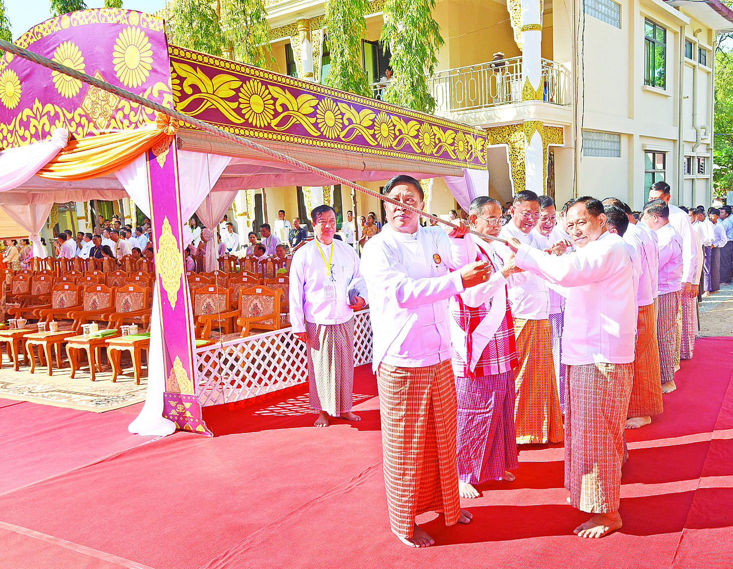 ဆက်လက်၍ ရွှေထီးတော်တင်လှူပူဇော်ခြင်းမင်္ဂလာအခမ်းအနားကို ဆက်လက်ကျင်းပရာ နိုင်ငံတော်စီမံအုပ်ချုပ်ရေးကောင်စီဥက္ကဋ္ဌ နိုင်ငံတော်ဝန်ကြီးချုပ်၏ဇနီးနှင့် အဖွဲ့ဝင်များ၊ အခမ်းအနားတက်ရောက်လာကြသူများနှင့် ဒေသခံပြည်သူများက မင်္ဂလာကြိုးဆွဲ၍ ရတနာစိန်ဖူးတော်၊ ငှက်မြတ်နားတော်တို့အား မင်္ဂလာရထားပျံဖြင့် စေတီတော်အထွတ်သို့ ပင့်ဆောင်ကြပြီး နိုင်ငံတော်စီမံအုပ်ချုပ်ရေးကောင်စီဥက္ကဋ္ဌ နိုင်ငံတော်ဝန်ကြီးချုပ်နှင့် အဖွဲ့ဝင်များက ရတနာစိန်ဖူးတော်၊ ငှက်မြတ်နားတော်တို့ကို စေတီတော်အထွတ်တွင် တင်လှူပူဇော်၍ ပရိတ်နံ့သာရည်များ ပက်ဖျန်းကြသည်။