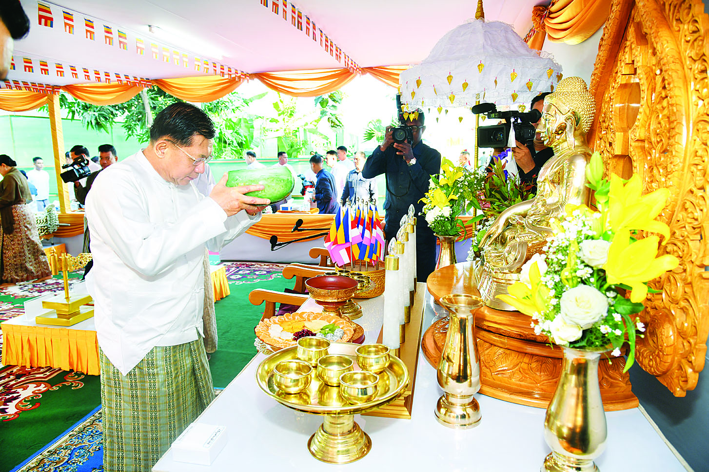 ထို့နောက် အခမ်းအနားကို “နမောတဿ” သုံးကြိမ်ရွတ်ဆို ဘုရားကန်တော့ဖွင့်လှစ်ပြီး နိုင်ငံတော်စီမံအုပ်ချုပ်ရေးကောင်စီဥက္ကဋ္ဌ နိုင်ငံတော်ဝန်ကြီးချုပ်နှင့်ဇနီး၊ အခမ်းအနားတက်ရောက်လာကြသူများက ပါဠိဆရာတော်ကြီးထံမှ ကိုးပါးသီလခံယူဆောက်တည်ကြကာ ဥပါသကာများက ပရိတ်ပန်း၊ ပရိတ်ရေ၊ ပရိတ်ချည်၊ ပရိတ်သဲများကို သံဃာတော်များထံ ဆက်ကပ်သည်။ ၎င်းနောက် သံဃာတော်အရှင်သူမြတ်တို့ ရွတ်ပွားချီးမြှင့်တော်မူကြသည့် ပရိတ်တရားတော်များကို နာယူကြည်ညိုကြသည်။