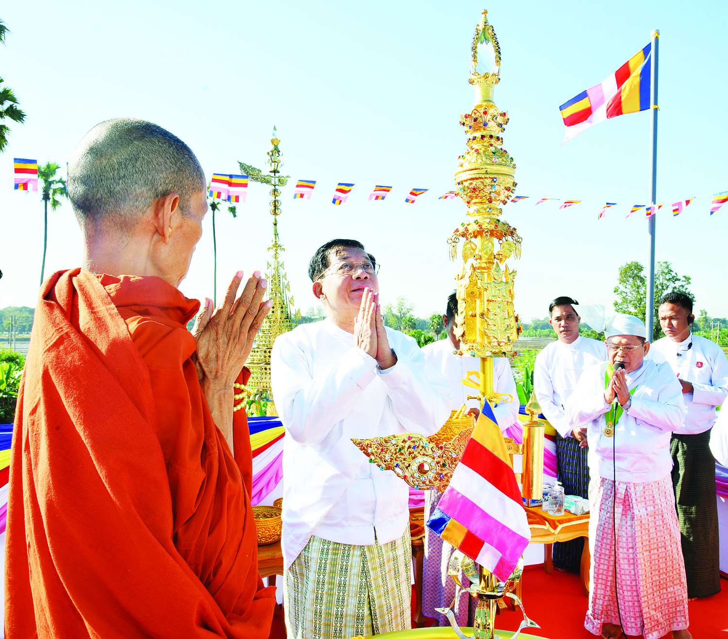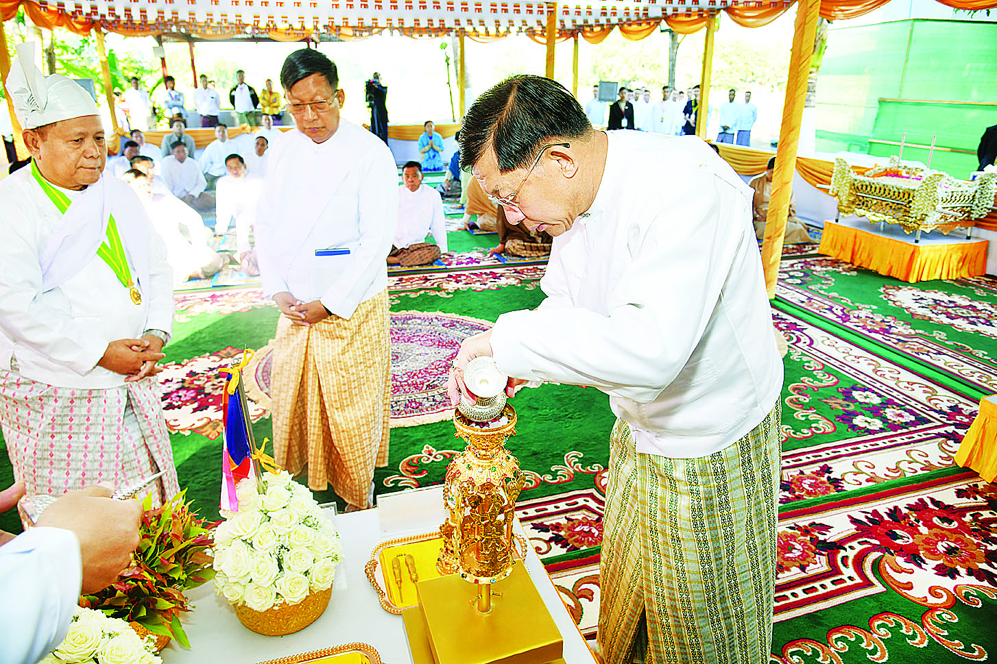 ထို့နောက် နိုင်ငံတော်စီမံအုပ်ချုပ်ရေးကောင်စီဥက္ကဋ္ဌ နိုင်ငံတော်ဝန်ကြီးချုပ်နှင့် အဖွဲ့ဝင်များက ရတနာစိန်ဖူးတော်၊ ငှက်မြတ်နားတော်နှင့် ရွှေထီးတော်ဘုံအဆင့်ဆင့်တို့ကို မင်္ဂလာအချိန်တွင် စေတီတော်အထွတ်၌ တင်လှူပူဇော်ကာ ပရိတ်နံ့သာရည်များ ပက်ဖျန်းပူဇော်ကြသည်။