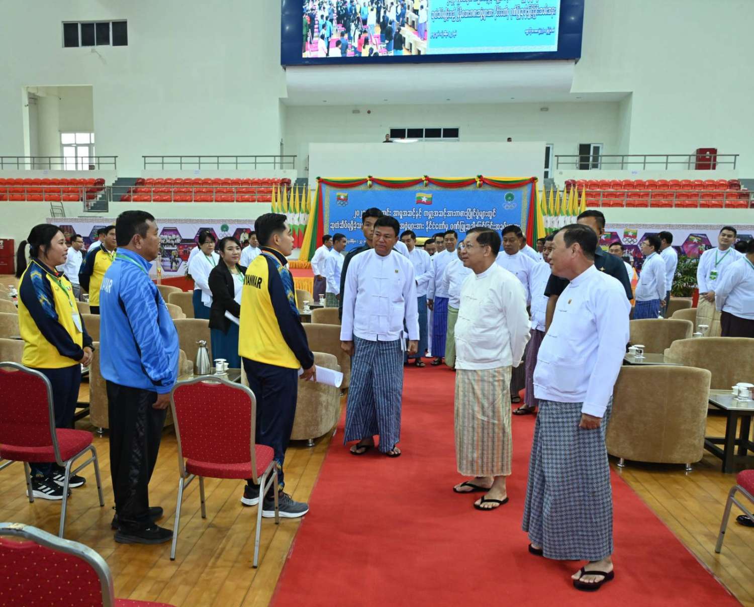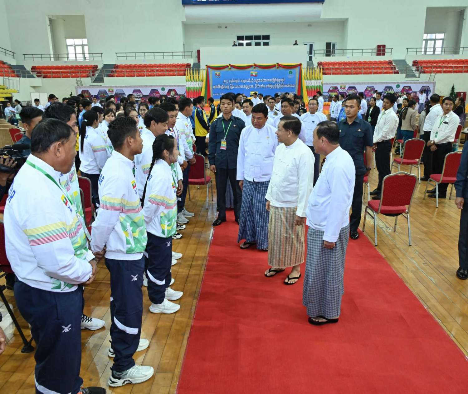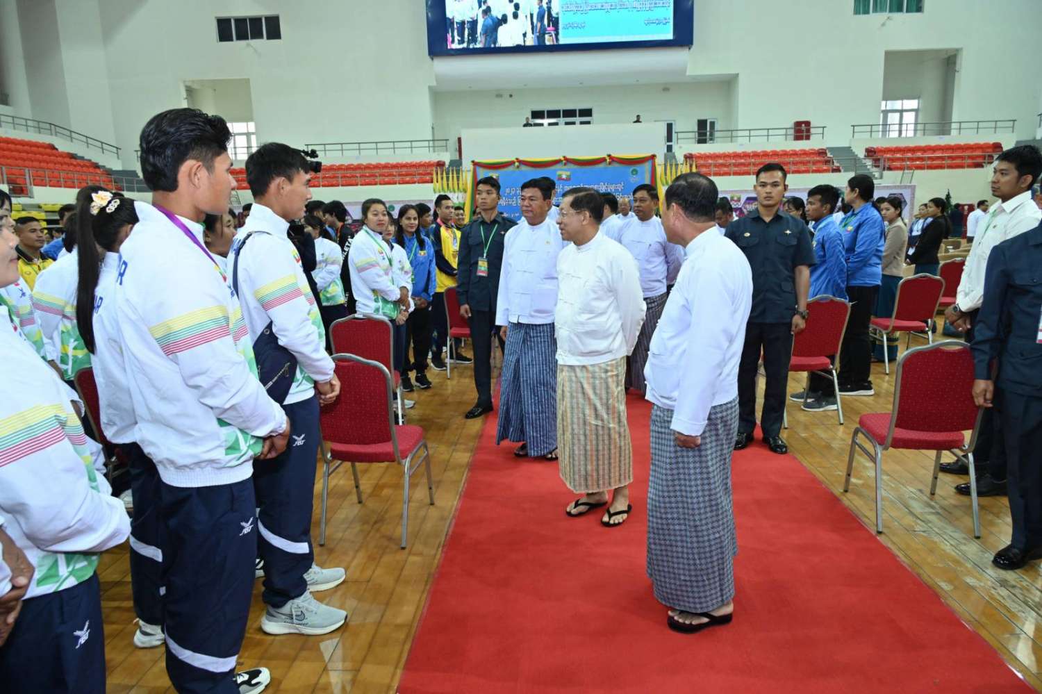 ယင်းနောက် နိုင်ငံတော်စီမံအုပ်ချုပ်ရေးကောင်စီဥက္ကဋ္ဌ နိုင်ငံတော်ဝန်ကြီးချုပ်နှင့် အဖွဲ့ဝင်များသည် နိုင်ငံ့ဂုဏ်ဆောင်အားကစားသမားများနှင့် နည်းပြများအား ရင်းရင်းနှီးနှီး နှုတ်ဆက်သည်။