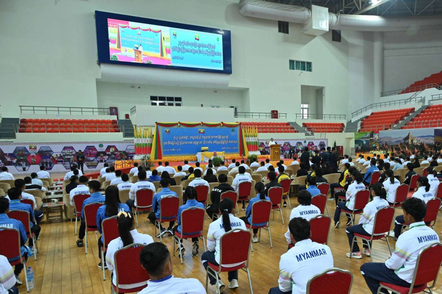 ၂၀၂၅ ခုနှစ်၊ ထိုင်းနိုင်ငံတွင် ကျင်းပပြုလုပ်မည့် (၃၃) ကြိမ်မြောက် အရှေ့တောင်အာရှအားကစားပြိုင်ပွဲတွင် အောင်မြင်မှုရရှိစေရေးအတွက်လည်း ၂၀၂၄ ခုနှစ်၊ ဒီဇင်ဘာလအတွင်း၌ ပဉ္စမအကြိမ်မြောက် အမျိုးသားအားကစားပွဲတော်ကို ကျင်းပပေးရန် စီစဉ်ဆောင်ရွက်လျက်ရှိပါကြောင်း၊ ပဉ္စမအကြိမ် အမျိုးသားအားကစားပွဲတော်ကြီးကို အားကစားနည်းအလိုက် ထူးချွန်ထက်မြက်သည့် မျိုးဆက်သစ်အားကစားသမားများ ပေါ်ထွက်ရေး၊ လူငယ်၊ လူရွယ်များအပါအဝင် ပြည်သူတစ်ရပ်လုံး အားကစားကို စိတ်ပါဝင်စားပြီး အားပေးဆောင်ရွက်လာစေရေး၊ တစ်မျိုးသားလုံး သက်ရှည်ကျန်းမာ ကြံ့ခိုင်စေရန်အထောက်အကူပြုနိုင်စေရေးဟူသည့် ရည်ရွယ်ချက်များဖြင့် ကျင်းပပေးသွားမည်ဖြစ်ကြောင်း၊ ဝန်ကြီးဌာနအသီးသီးနှင့် ပြည်နယ်၊ တိုင်းဒေသကြီးအစိုးရအဖွဲ့များအနေဖြင့်လည်း ဝန်ကြီးဌာနများနှင့် ပြည်နယ်၊ တိုင်းဒေသကြီးကိုယ်စားပြုအသင်းများကို ၂၀၂၄ ခုနှစ် အမျိုးသားအားကစားပွဲတော်ကြီးတွင် အဆင့်မီမီအင်ပြည့်အားပြည့် ဝင်ရောက်ယှဉ်ပြိုင်နိုင်ရေး ကြိုတင်ပြင်ဆင်စီမံဆောင်ရွက်သွားကြရန်နှင့် ပြိုင်ပွဲကြီး အောင်မြင်စွာ ကျင်းပနိုင်ရေးအတွက်လည်း သက်ဆိုင်ရာအခန်းကဏ္ဍအလိုက် ဝိုင်းဝန်းပူးပေါင်းဆောင်ရွက်ပေးကြရန် တစ်ပါတည်းမှာကြားလိုကြောင်း။