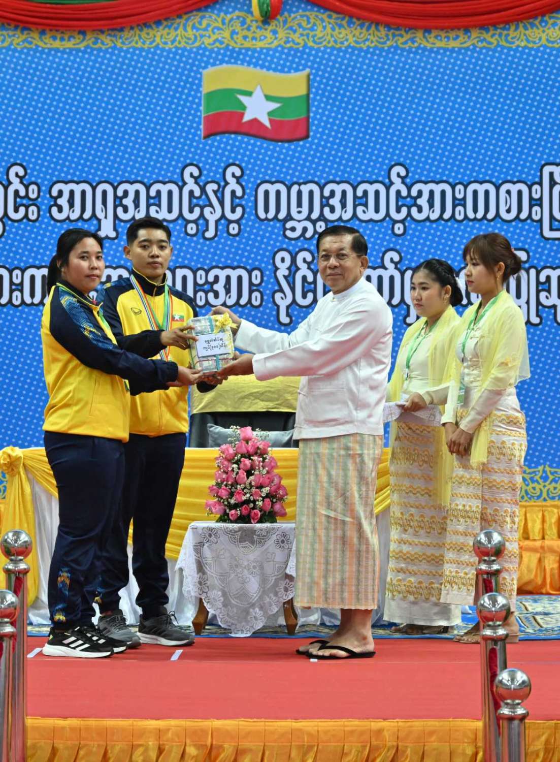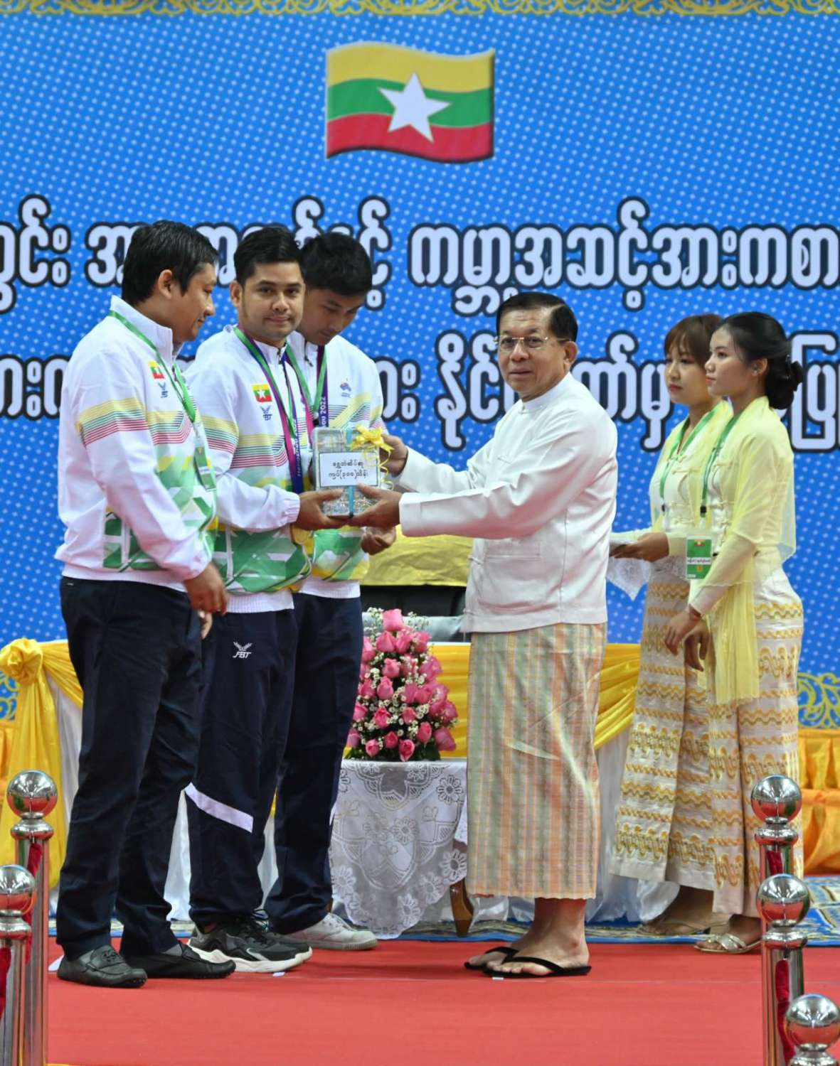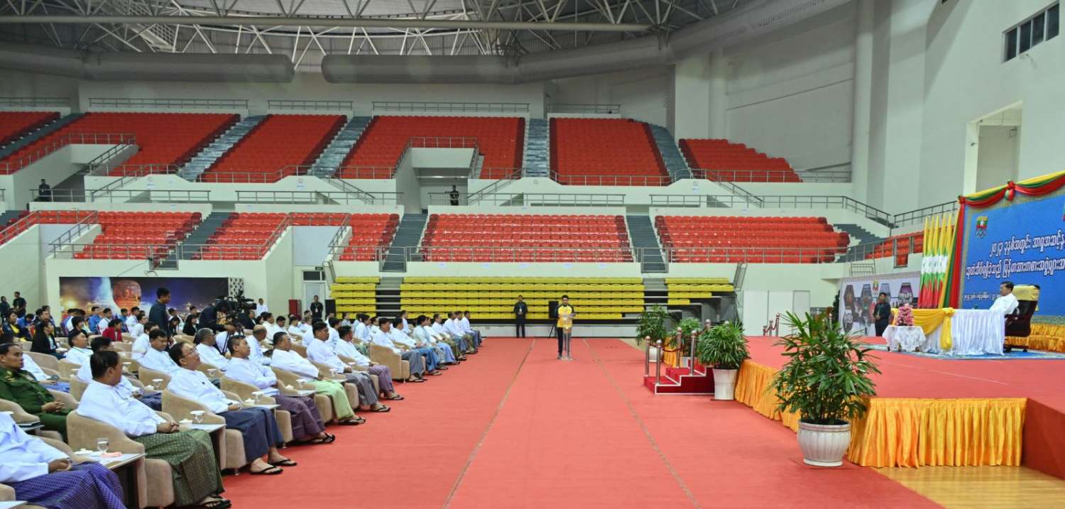 နိုင်ငံတော်စီမံအုပ်ချုပ်ရေးကောင်စီဥက္ကဋ္ဌ နိုင်ငံတော်ဝန်ကြီးချုပ် ဗိုလ်ချုပ်မှူးကြီး မင်းအောင်လှိုင် ၂၀၂၃ ခုနှစ်အတွင်း အာရှအဆင့်နှင့် ကမ္ဘာ့အဆင့်အားကစားပြိုင်ပွဲများတွင် ဆုတံဆိပ်ရရှိခဲ့သည့် မြန်မာအားကစားအဖွဲ့များအား နိုင်ငံတော်ကဂုဏ်ပြုဆုချီးမြှင့်သည့် အခမ်းအနားသို့ တက်ရောက်အမှာစကားပြောကြားပြီး ဂုဏ်ပြုဆုများပေးအပ်ချီးမြှင့်