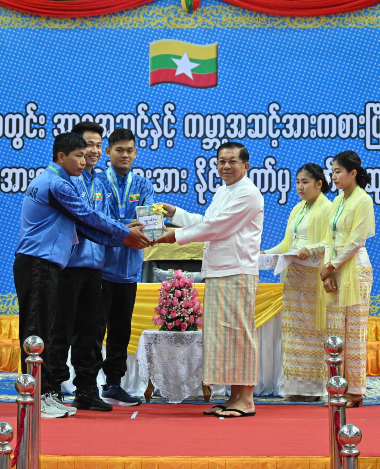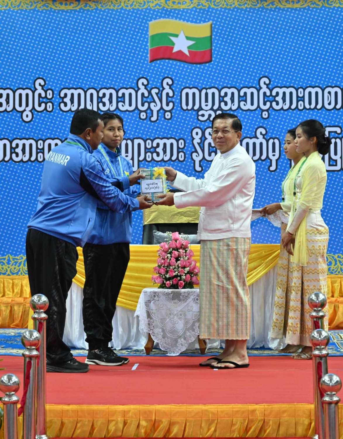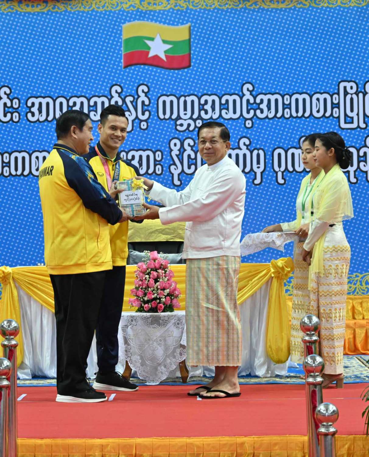 နိုင်ငံတော်စီမံအုပ်ချုပ်ရေးကောင်စီဥက္ကဋ္ဌ နိုင်ငံတော်ဝန်ကြီးချုပ် ဗိုလ်ချုပ်မှူးကြီး မင်းအောင်လှိုင် ၂၀၂၃ ခုနှစ်အတွင်း အာရှအဆင့်နှင့် ကမ္ဘာ့အဆင့်အားကစားပြိုင်ပွဲများတွင် ဆုတံဆိပ်ရရှိခဲ့သည့် မြန်မာအားကစားအဖွဲ့များအား နိုင်ငံတော်ကဂုဏ်ပြုဆုချီးမြှင့်သည့် အခမ်းအနားသို့ တက်ရောက်အမှာစကားပြောကြားပြီး ဂုဏ်ပြုဆုများပေးအပ်ချီးမြှင့်