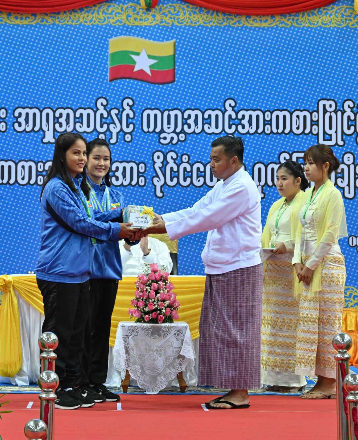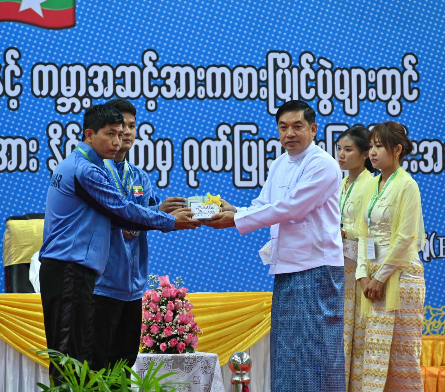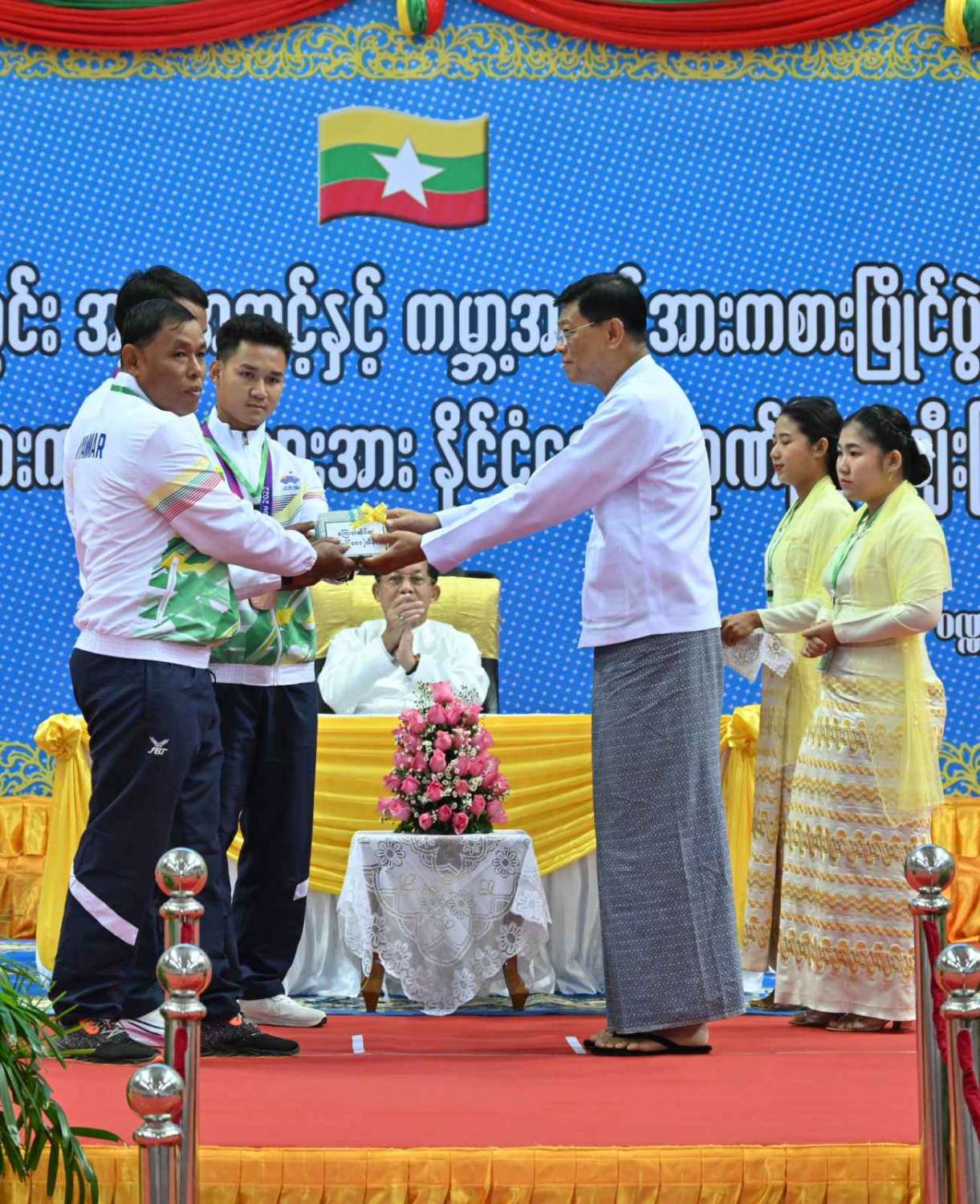 ဆက်လက်ပြီး ကောင်စီဝင် ဗိုလ်ချုပ်ကြီး မြထွန်းဦးက ကြေးတံဆိပ်ဆု ၅ ဆု ဆွတ်ခူးပေးနိုင်ခဲ့သည့် လှေလှော်အားကစားအဖွဲ့နှင့် ပြေးခုန်ပစ် (မသန်စွမ်း) အားကစားအဖွဲ့တို့အားလည်းကောင်း၊ ကောင်စီဝင် ဗိုလ်ချုပ်ကြီး တင်အောင်စန်းက ကြေးတံဆိပ်ဆု ၅ ဆု ဆွတ်ခူးပေးနိုင်ခဲ့သည့် ဗိုဗီနမ်အားကစားအဖွဲ့အားလည်းကောင်း၊ ကောင်စီဝင် ဒုတိယဗိုလ်ချုပ်ကြီး ညိုစောက ကြေးတံဆိပ်ဆု ၄ ဆု ဆွတ်ခူးပေးနိုင်ခဲ့သည့် ဗိုဗီနမ်အားကစားအဖွဲ့အားလည်းကောင်း ဂုဏ်ပြုဆုများ အသီးသီးပေးအပ်ချီးမြှင့်ကြသည်။