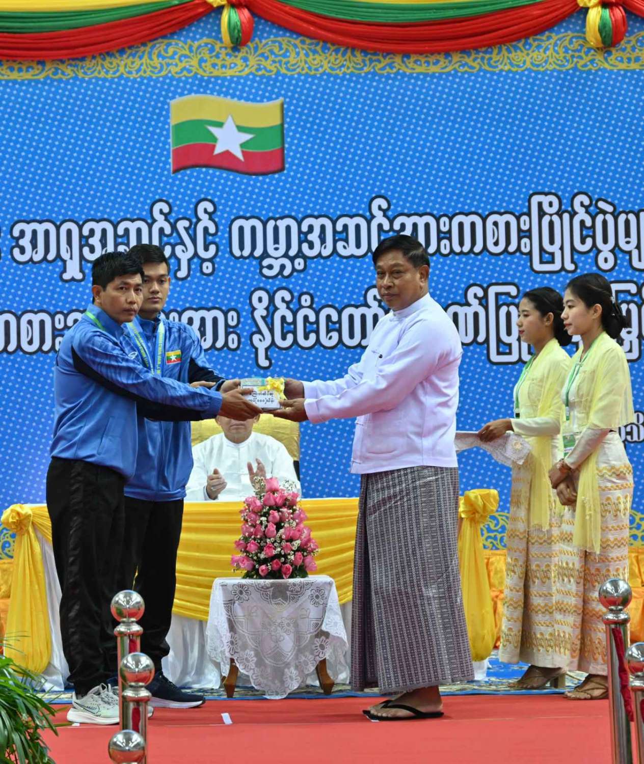 အခမ်းအနားသို့ နိုင်ငံတော်စီမံအုပ်ချုပ်ရေးကောင်စီဥက္ကဋ္ဌ နိုင်ငံတော်ဝန်ကြီးချုပ်နှင့်အတူ ကောင်စီတွဲဖက်အတွင်းရေးမှူး ဒုတိယဗိုလ်ချုပ်ကြီး ရဲဝင်းဦး၊ ကောင်စီဝင်များ၊ ပြည်ထောင်စုဝန်ကြီးများ၊ နေပြည်တော်ကောင်စီဥက္ကဋ္ဌ၊ ကာကွယ်ရေးဦးစီးချုပ်ရုံးမှ အဆင့်မြင့်တပ်မတော်အရာရှိကြီးများ၊ နေပြည်တော်တိုင်းစစ်ဌာနချုပ်တိုင်းမှူး၊ ဒုတိယဝန်ကြီးများ၊ မြန်မာနိုင်ငံအားကစားအဖွဲ့ချုပ်များမှ ဥက္ကဋ္ဌများနှင့် ဒုတိယဥက္ကဋ္ဌများ၊ ဖိတ်ကြားထားသူများ၊ ၂၀၂၃ ခုနှစ်အတွင်း အာရှအဆင့်နှင့် ကမ္ဘာ့အဆင့်အားကစားပြိုင်ပွဲများတွင် နိုင်ငံ့ဂုဏ်ဆောင်ခဲ့ကြသည့် အားကစားအဖွဲ့များမှ အုပ်ချုပ်သူများ၊ နည်းပြများ၊ အားကစားမောင်မယ်များနှင့် တာဝန်ရှိသူများ တက်ရောက်ကြသည်။