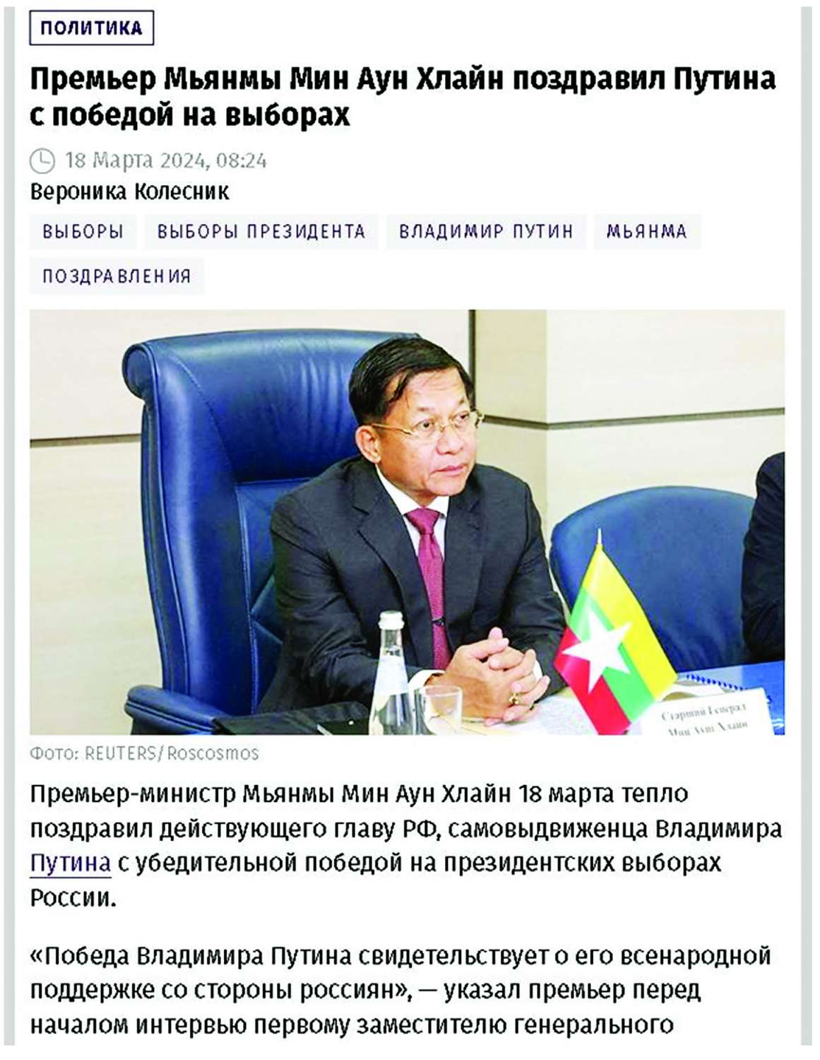 ရုရှားဖက်ဒရေးရှင်းနိုင်ငံသမ္မတရွေးကောက်ပွဲတွင် အနိုင်ရရှိသော Vladimir Vladimirovich Putin ထံသို့ နိုင်ငံတော်စီမံအုပ်ချုပ်ရေးကောင်စီဥက္ကဋ္ဌ နိုင်ငံတော်ဝန်ကြီးချုပ် ဗိုလ်ချုပ်မှူးကြီး မင်းအောင်လှိုင် အပါအဝင် ကမ္ဘာ့နိုင်ငံအသီးသီးမှ နိုင်ငံ့ခေါင်းဆောင်များက ဝမ်းမြောက်ကြောင်း သဝဏ်လွှာများပေးပို့ခဲ့ကြောင်း သတင်းဖော်ပြ