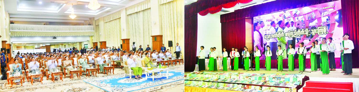 ပြည်ထောင်စုနယ်မြေ နေပြည်တော် “စာကြည့်တိုက်များ ဖွံ့ဖြိုးတိုးတက်ရေးနှင့် စာဖတ်ရှိန်မြှင့်တင်ရေးလှုပ်ရှားမှု” အခမ်းအနားကို ယနေ့နံနက်ပိုင်းတွင် နေပြည်တော် မြို့တော်ခန်းမ၌ကျင်းပပြုလုပ်ရာ နိုင်ငံတော်စီမံအုပ်ချုပ်ရေးကောင်စီဥက္ကဋ္ဌ နိုင်ငံတော်ဝန်ကြီးချုပ် ဗိုလ်ချုပ်မှူးကြီး မင်းအောင်လှိုင်နှင့်ဇနီး ဒေါ်ကြူကြူလှတို့ တက်ရောက်သည်။