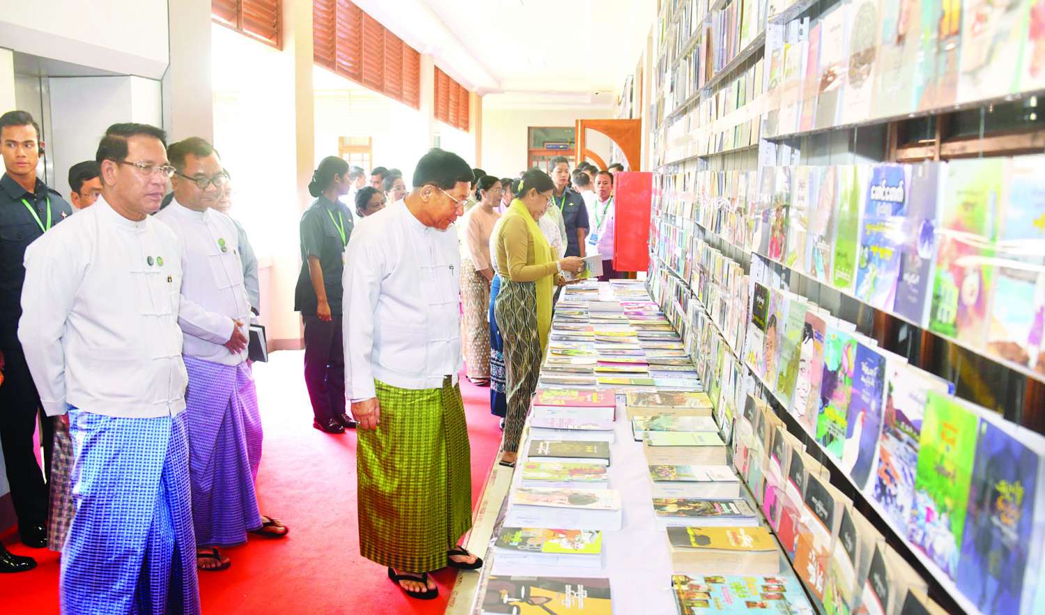 ယင်းနောက် နိုင်ငံတော်စီမံအုပ်ချုပ်ရေးကောင်စီဥက္ကဋ္ဌ နိုင်ငံတော်ဝန်ကြီးချုပ်နှင့် အခမ်းအနား တက်ရောက်လာကြသူများသည် ခင်းကျင်းပြသထားသည့် စာအုပ်စာစောင်များနှင့် ဓာတ်ပုံမှတ်တမ်းများအား စိတ်ပါဝင်စားစွာဖြင့် လှည့်လည်ကြည့်ရှုကြသည်။