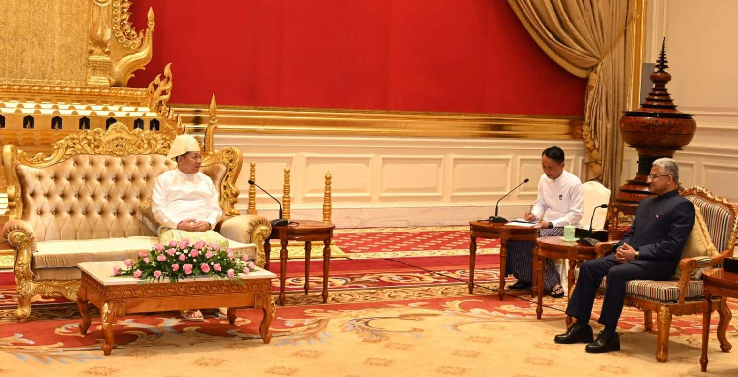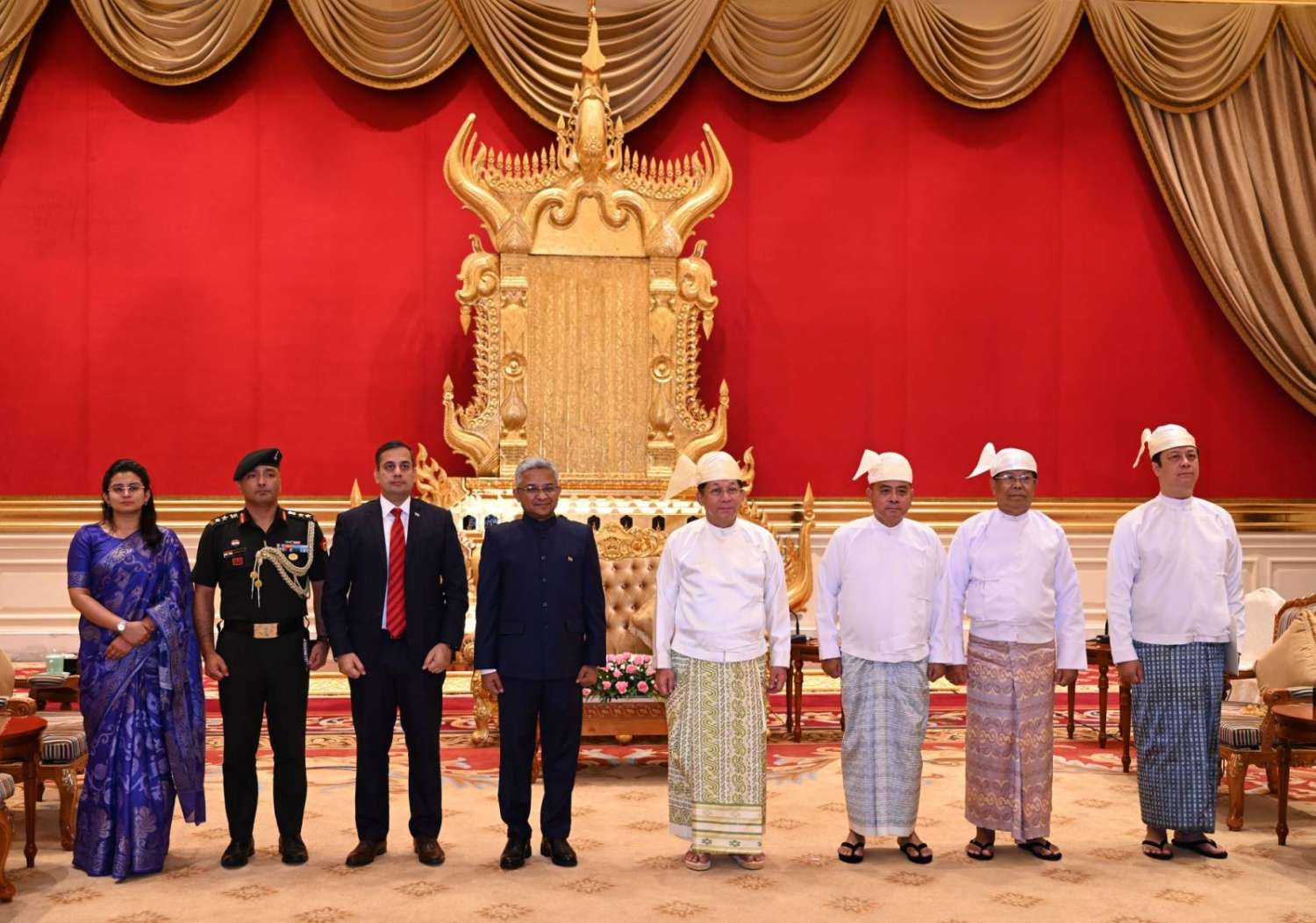 တွေ့ဆုံပွဲအပြီးတွင် နိုင်ငံတော်စီမံအုပ်ချုပ်ရေးကောင်စီဥက္ကဋ္ဌ နိုင်ငံတော်ဝန်ကြီးချုပ်နှင့် မြန်မာနိုင်ငံဆိုင်ရာ အိန္ဒိယနိုင်ငံသံအမတ်ကြီးတို့သည် စုပေါင်းမှတ်တမ်းတင်ဓာတ်ပုံရိုက်ကြသည်။