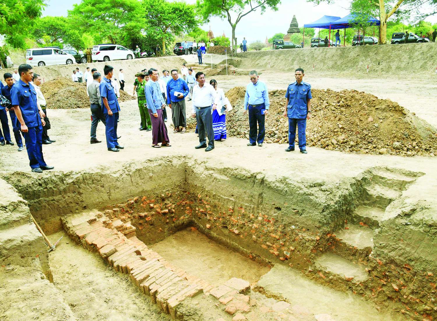 ယင်းနောက် နိုင်ငံတော်စီမံအုပ်ချုပ်ရေးကောင်စီဥက္ကဋ္ဌ နိုင်ငံတော်ဝန်ကြီးချုပ်နှင့်အဖွဲ့ဝင်များသည် ရွာဟောင်းကြီးကျေးရွာအနီးရှိ ရွာဟောင်းကြီးကန်နှင့်ရေတော်မုနိ ဘုရားအနီးရှိ ရေတော်မုနိကန် တူးဖော်နေမှုအခြေအနေများကို သွားရောက်ကြည့်ရှုစစ်ဆေးရာ ရှေးဟောင်းသုတေသနနှင့်အမျိုးသားပြတိုက်ဦးစီးဌာနမှ တာဝန်ရှိသူများက ရေကန်များ တူးဖော်ရေးလုပ်ငန်းဆောင်ရွက်စဉ် ရှေးဟောင်းရေကန်အုတ်ရိုးများ ပေါ်ထွက်လာခဲ့သဖြင့် ရှေးဟောင်းအမွေအနှစ်တူးဖော်ရေးလုပ်ငန်းများ ဆောင်ရွက်နေမှုအခြေအနေများကို ရှင်းလင်းတင်ပြကြသည်။ ရှင်းလင်းတင်ပြမှုများအပေါ် နိုင်ငံတော်စီမံအုပ်ချုပ်ရေးကောင်စီဥက္ကဋ္ဌ နိုင်ငံတော်ဝန်ကြီးချုပ်က ပုဂံဒေသစိမ်းလန်းစိုပြေရေးနှင့် သဘာဝပတ်ဝန်းကျင်ထိန်းသိမ်းရေးလုပ်ငန်းများအား စီမံချက်ချ၍ဆောင်ရွက်စဉ် ယခုကဲ့သို့ ရှေးဟောင်းအမွေအနှစ်များ ပေါ်ထွက်လာခြင်းသည် အဖိုးမဖြတ်နိုင်သည့် အကျိုးအမြတ်တစ်ခုပင်ဖြစ်ကြောင်း၊ ပေါ်ထွက်လာသည့် အုတ်ရိုးနမူနာအချို့အား အမျိုးအစားခွဲ၍ စနစ်တကျထိန်းသိမ်းထားရှိရန်လိုကြောင်း၊ မိုးတွင်းကာလသို့ ရောက်ရှိပါက တူးဖော်ရေးလုပ်ငန်းဧရိယာအတွင်းသို့ ရေများဝင်ရောက်မှုမရှိစေရေးအတွက်လည်း ကြိုတင်ပြင်ဆင်ဆောင်ရွက်ထားရှိရန်လိုကြောင်းဖြင့် မှာကြားသည်။ ထိုကဲ့သို့ ပုဂံရှေးဟောင်းယဉ်ကျေးမှုနယ်မြေအတွင်းရှိ ရှေးဟောင်းကန်များ ပြန်လည်ပြုပြင်ဆောင်ရွက်လျက်ရှိမှု အခြေအနေများအား လိုက်လံကြည့်ရှုစစ်ဆေးစဉ် နိုင်ငံတော်စီမံအုပ်ချုပ်ရေးကောင်စီဥက္ကဋ္ဌ နိုင်ငံတော်ဝန်ကြီးချုပ်သည် ပုဂံရှေးဟောင်းယဉ်ကျေးမှုနယ်မြေအတွင်း၌ တန်ဖိုးမဖြတ်နိုင်သည့် ရှေးဟောင်းယဉ်ကျေးမှုလက်ရာများ အမြောက်အများရှိသည့်အတွက် ကြည့်ရှုလေ့လာသူများ၏ မဆင်မခြင်လုပ်ရပ်များနှင့် သဘာဝဘေးဒဏ်တို့ကြောင့် ပျက်စီးဆုံးရှုံးမှုများမဖြစ်ပေါ်စေရေး စနစ်တကျ ထိန်းသိမ်းဆောင်ရွက်ရန် မိမိတို့အနေဖြင့် တာဝန်ရှိကြောင်း၊ ထို့ကြောင့် သဘာဝပတ် ဝန်းကျင်ထိန်းသိမ်းရေးလုပ်ငန်းများ၊ ရှေးဟောင်းယဉ်ကျေးမှုနယ်မြေအတွင်း စိုက်ပျိုးမြေသုံးစွဲမှုအပါအဝင် အခြားမြေအသုံးချမှုများ စနစ်တကျရှိစေရေး တာဝန်ရှိသူများအနေဖြင့် ကြပ်မတ်ဆောင်ရွက်သွားရန်လိုပြီး သတ်မှတ်ထားသည့် စည်းမျဉ်းဥပဒေများနှင့်အညီဖြစ်ရန်လိုကြောင်း၊ အညာဒေသ၏ အငွေ့အသက်များလျော့နည်းပပျောက် မှုမရှိစေရေးအတွက် စိုက်ပျိုးမြေများ၊ ဥယျာဉ်ခြံမြေများ၏ ခြံစည်းရိုးအနားသတ်များတွင် ထန်း၊ မန်ကျည်း၊ တမာနှင့်ထနောင်းတို့ကဲ့သို့သော အညာဒေသနှင့်ကိုက်ညီသည့် အပင်များစိုက်ပျိုးကြရန်လိုကြောင်း၊ ဧရိယာကျယ်ဝန်းသည့်စိုက်ခင်းများ
