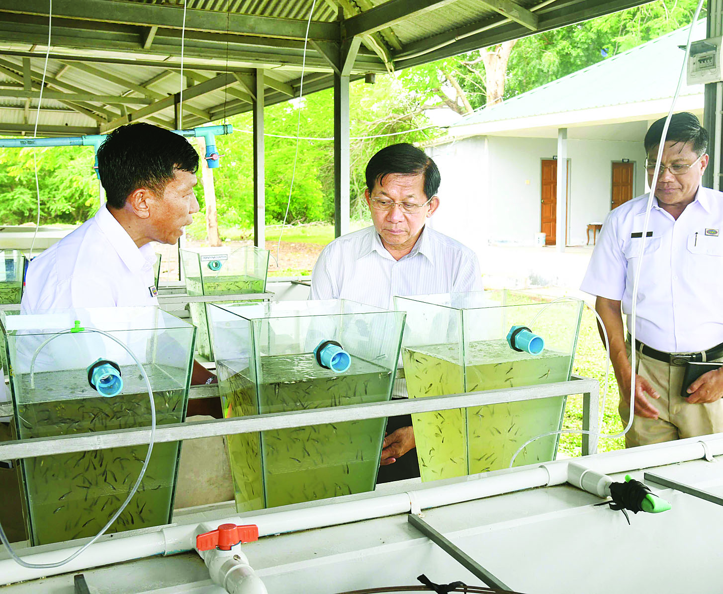 ယင်းနောက် နိုင်ငံတော်စီမံအုပ်ချုပ်ရေးကောင်စီဥက္ကဋ္ဌ နိုင်ငံတော်ဝန်ကြီးချုပ်သည် မွေးမြူရေးဇုန်အတွင်းရှိ ငါးသားဖောက်လုပ်ငန်းဆောင်ရွက်နေမှုနှင့် ငါးသားပေါက်မွေးမြူထားရှိမှု အခြေအနေများအား လှည့်လည်ကြည့်ရှုစစ်ဆေးပြီး တာဝန်ရှိသူများ၏ တင်ပြချက်များအပေါ် လိုအပ်သည်များ မှာကြားသည်။