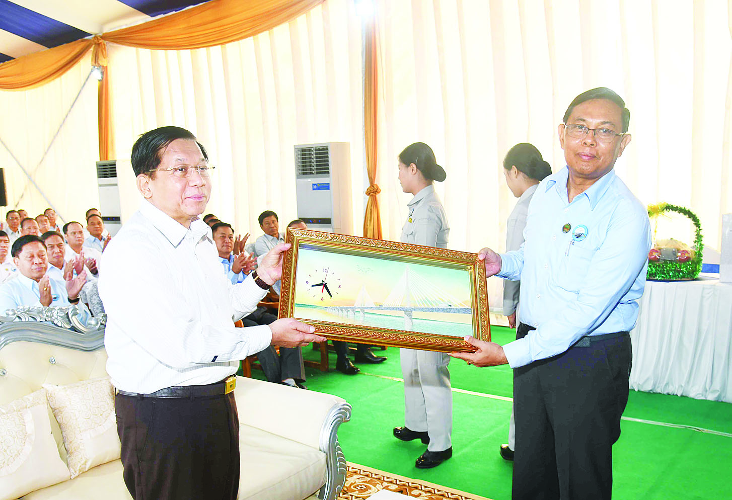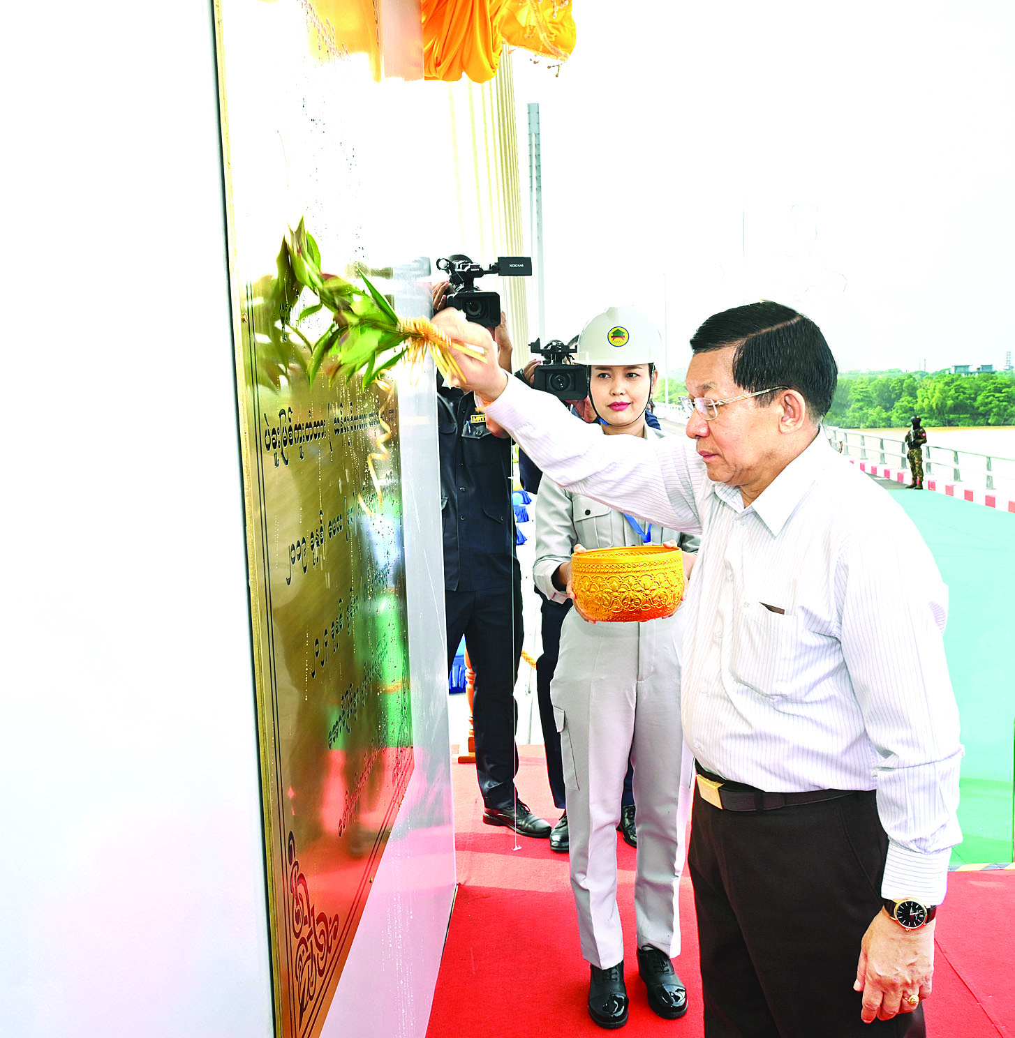 ထို့နောက် နိုင်ငံတော်စီမံအုပ်ချုပ်ရေးကောင်စီဥက္ကဋ္ဌ နိုင်ငံတော်ဝန်ကြီးချုပ်သည် တံတားတည်ဆောက်ရေးတွင်ပါဝင်ခဲ့ကြသည့် တည်ဆောက်ရေးအင်ဂျင်နီယာအဖွဲ့အား သစ်သီးခြင်းနှင့် လက်ဆောင်ပစ္စည်းများပေးအပ်သည်။