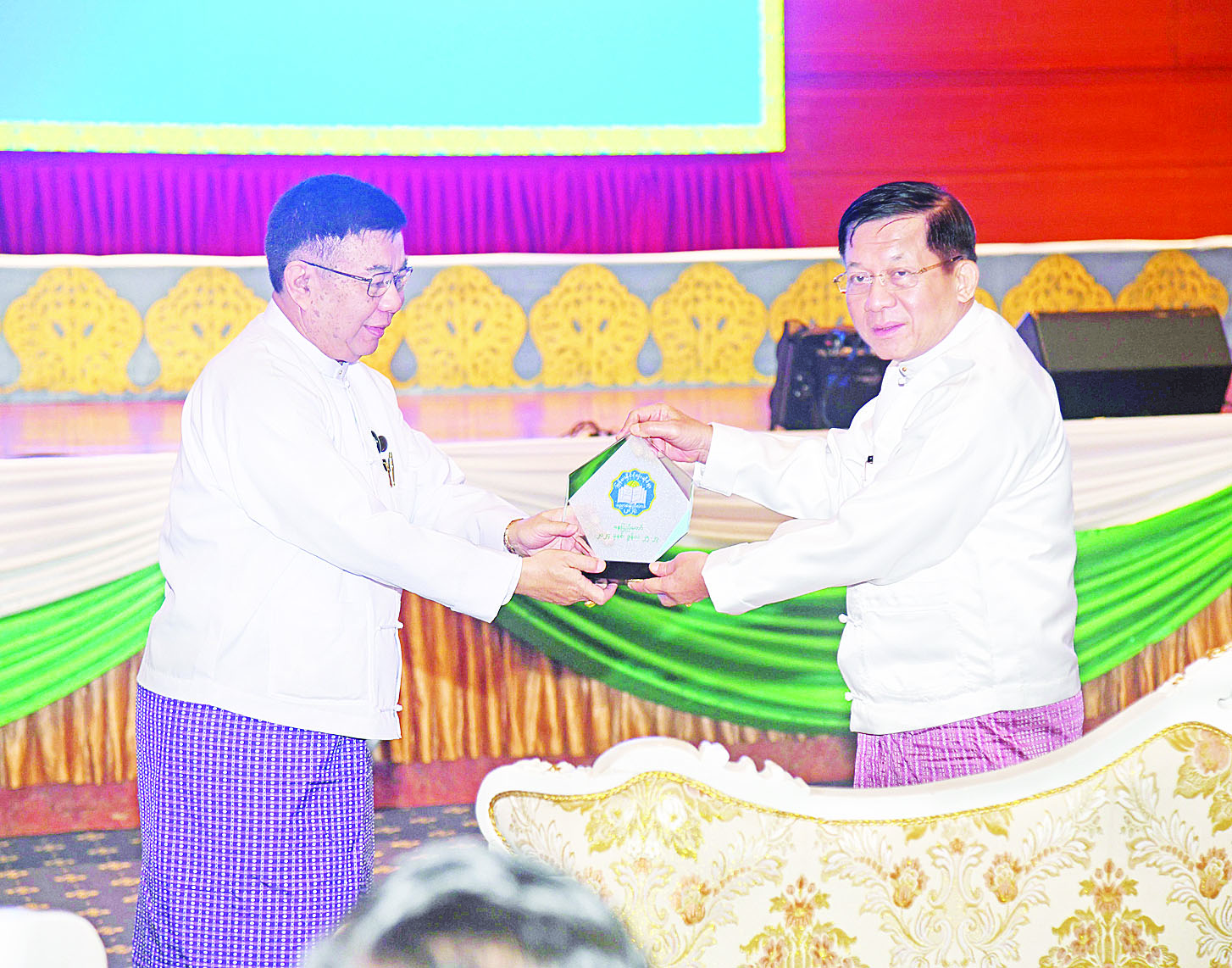 ထို့နောက် နိုင်ငံတော်စီမံအုပ်ချုပ်ရေးကောင်စီဥက္ကဋ္ဌ နိုင်ငံတော်ဝန်ကြီးချုပ် ဗိုလ်ချုပ်မှူးကြီး မင်းအောင်လှိုင်ထံ မြန်မာနိုင်ငံလုံးဆိုင်ရာပညာရေးညီလာခံ (၂၀၂၄) ကျင်းပရေးဦးစီးကော်မတီ အတွင်းရေးမှူး၊ ပညာရေးဝန်ကြီးဌာန ပြည်ထောင်စုဝန်ကြီး ဒေါက်တာညွန့်ဖေက မြန်မာနိုင်ငံလုံးဆိုင်ရာပညာရေးညီလာခံ (၂၀၂၄) အထိမ်းအမှတ်လက်ဆောင်ကို ဂါရဝပြုပေးအပ်သည်။