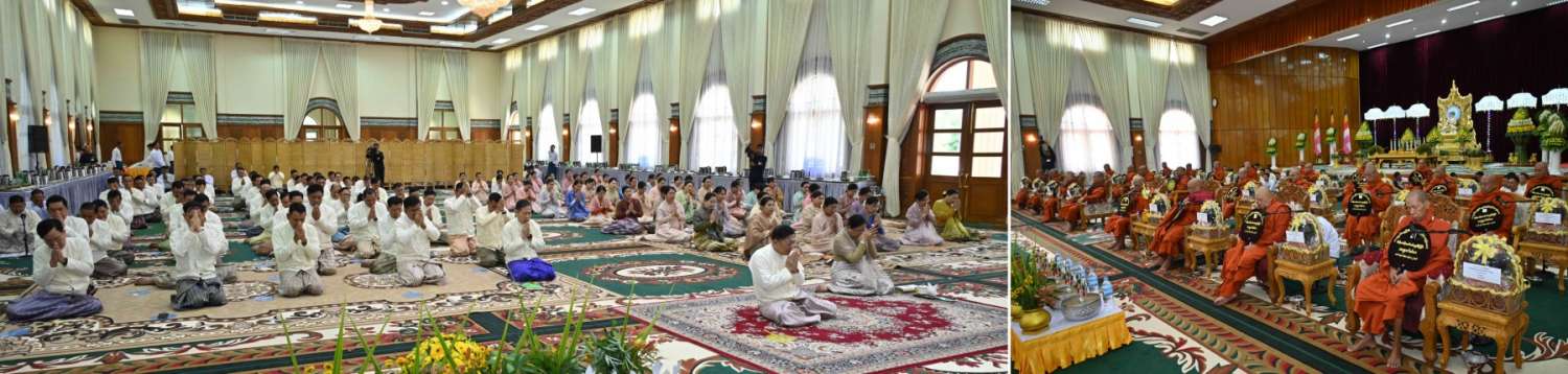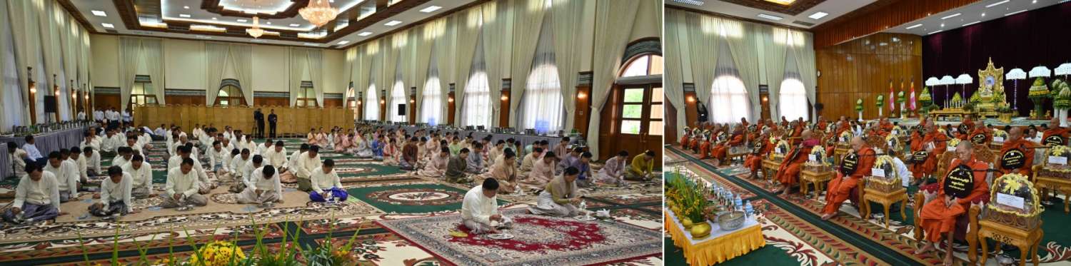 ယင်းနောက် အခမ်းအနားကို နမောတဿ သုံးကြိမ်ရွတ်ဆိုဘုရားကန်တော့ဖွင့်လှစ်၍ နိုင်ငံတော်စီမံအုပ်ချုပ်ရေးကောင်စီဥက္ကဋ္ဌ တပ်မတော်ကာကွယ်ရေးဦးစီးချုပ်နှင့် ဇနီး၊ အခမ်းအနားတက်ရောက်လာကြသူများက နိုင်ငံတော်သံဃမဟာနာယကအဖွဲ့ဥက္ကဋ္ဌ သန်လျင်မင်းကျောင်းဆရာတော်ကြီးထံမှ ကိုးပါးသီလခံယူဆောက်တည်ကြပြီး ဆရာတော်ကြီးများ ရွတ်ပွားချီးမြှင့်တော်မူသည့် မေတ္တသုတ်ပရိတ်တရားတော်များကို နာယူကြည်ညိုကြသည်။