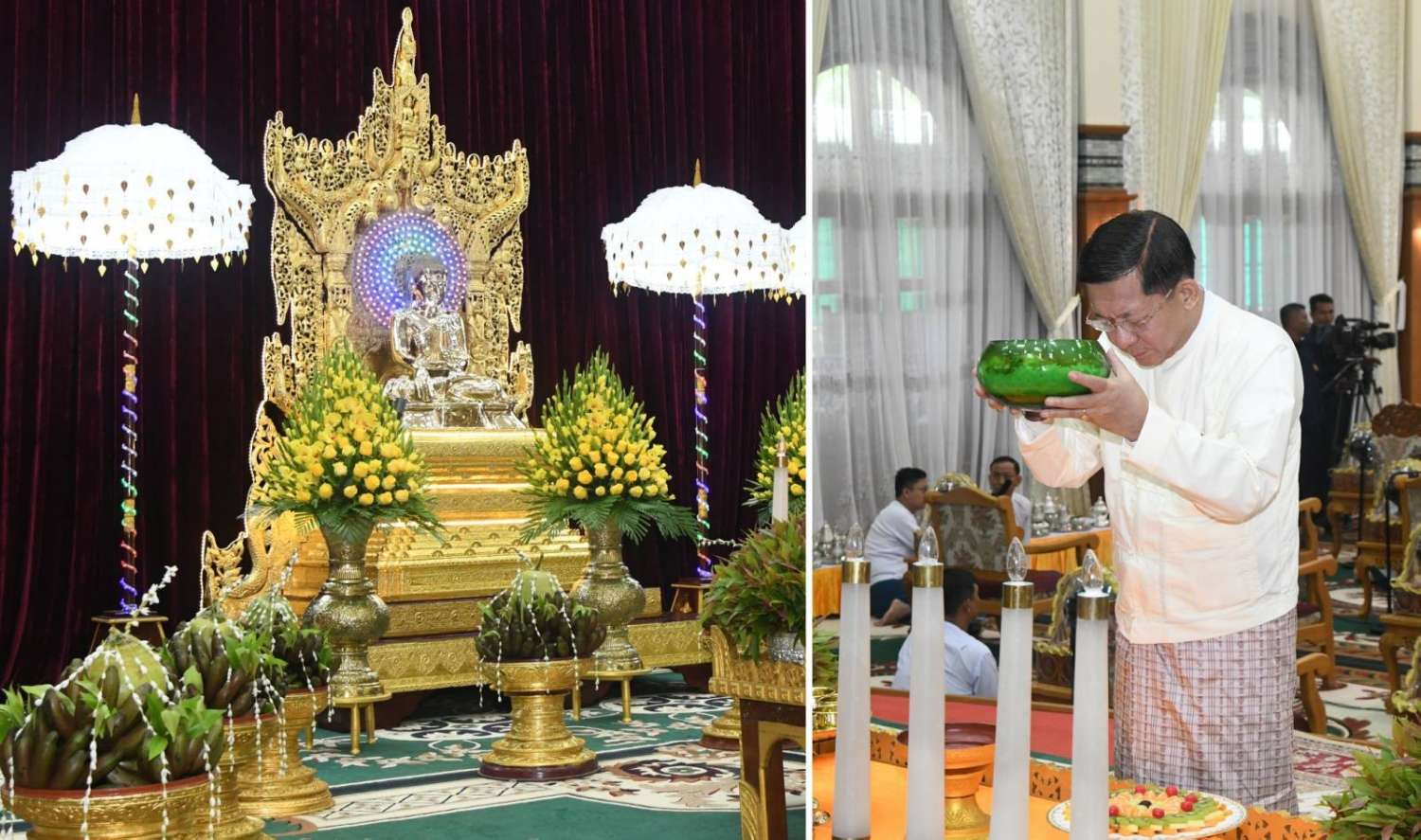 ဦးစွာ နိုင်ငံတော်စီမံအုပ်ချုပ်ရေးကောင်စီဥက္ကဋ္ဌ တပ်မတော်ကာကွယ်ရေးဦးစီးချုပ်က အနော်ရထာခန်းမအတွင်းရှိ ဗုဒ္ဓရုပ်ပွားတော်မြတ်အား ဖူးမြော်ကြည်ညို၍ မြသပိတ်ဆွမ်းတော်၊ သစ်သီး၊ ပန်း၊ သောက်တော်ရေချမ်းနှင့် ဆီမီးတို့ကို ကပ်လှူပူဇော်သည်။