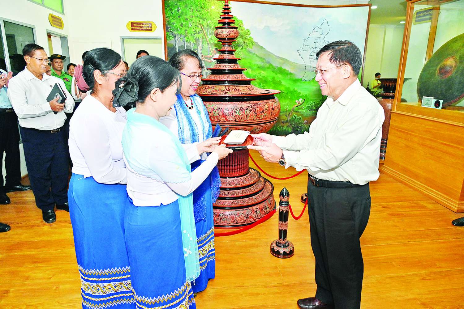 ယင်းနောက် ယွန်းပြတိုက်အတွင်း အထူးပြခန်း၊ ယွန်းပစ္စည်းပြုလုပ်ပုံ အဆင့်ဆင့်ပြခန်း၊ နိုင်ငံတကာ ယွန်းပစ္စည်းပြခန်း၊ လူမှုရေးအသုံးအဆောင်ပစ္စည်း ပြခန်းတို့တွင် ခင်းကျင်းပြသထားသည့် ယွန်းထည်များအား ပြခန်းတစ်ခုချင်းစီအလိုက် ခင်းကျင်းပြသထားမှုများကို စိတ်ဝင်တစားလှည့်လည်ကြည့်ရှုပြီး တာဝန်ရှိသူများ၏ ရှင်းလင်းမှုများအပေါ် သိရှိလို သည်များ ပြန်လည်မေးမြန်းဆွေးနွေးပြီး မိမိတို့နိုင်ငံမှပြုလုပ်သည့် ယွန်းထည်ပစ္စည်းနှင့် စဉ့်ထည်ပစ္စည်းများသည် နာမည်ကောင်းရရှိပြီးဖြစ်သည့်အတွက် ယင်းပညာရပ်များ မပျောက်ပျက်သွားစေရေး ဆက်လက်လက်ဆင့်ကမ်း ထိန်းသိမ်းသွားကြစေလိုကြောင်း၊ ကျောင်းသား၊ ကျောင်းသူများကိုလည်း လိုအပ်သည့်ထောက်ပံ့မှုများ ဆောင်ရွက်ပေးသွားရန်လိုကြောင်းဖြင့် မှာကြားသည်။