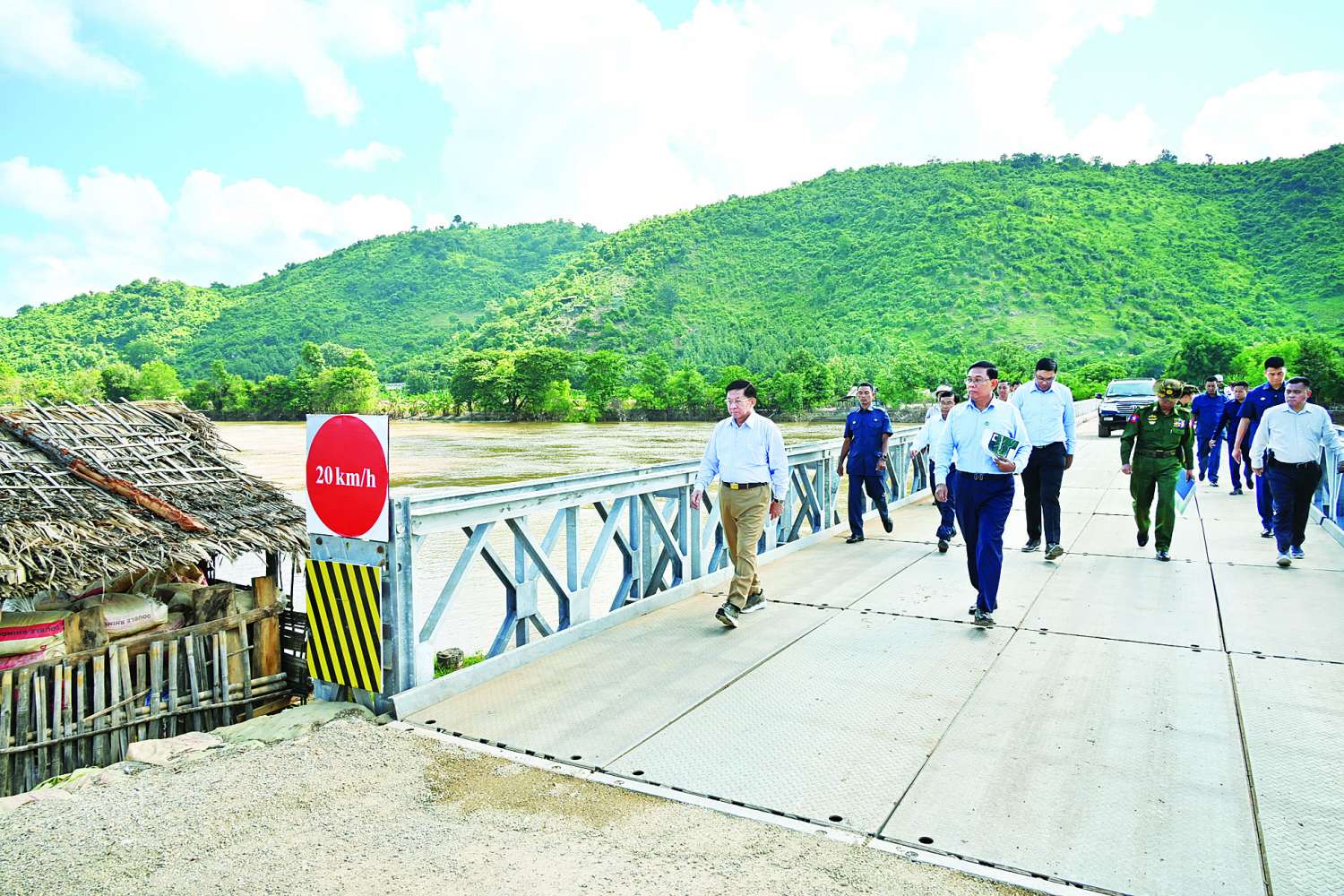 ယင်းနောက် နိုင်ငံတော်စီမံအုပ်ချုပ်ရေးကောင်စီဥက္ကဋ္ဌ နိုင်ငံတော်ဝန်ကြီးချုပ်နှင့် အဖွဲ့ဝင်များသည် နဝင်းချောင်းတံတား (အဆုံ) နေရာသို့ ရောက်ရှိကြပြီး ရေတိုက်စားမှုကြောင့် တံတားချဉ်းကပ်လမ်း ပြိုကျပျက်စီးခဲ့မှုအား ယာယီဘေလီတံတား တည်ဆောက်ပြုပြင်ပြီးစီးမှုနှင့် တံတားချဉ်းကပ်လမ်း ကမ်းကပ်ခုံအား ပြန်လည်ပြုပြင်ဆောင်ရွက်နေမှုအခြေအနေများကို ကြည့်ရှုစစ်ဆေးပြီး တာဝန်ရှိသူများ၏ တင်ပြချက်များအပေါ် လိုအပ်သည်များ မှာကြားခဲ့ကြောင်း သတင်းရရှိသည်။