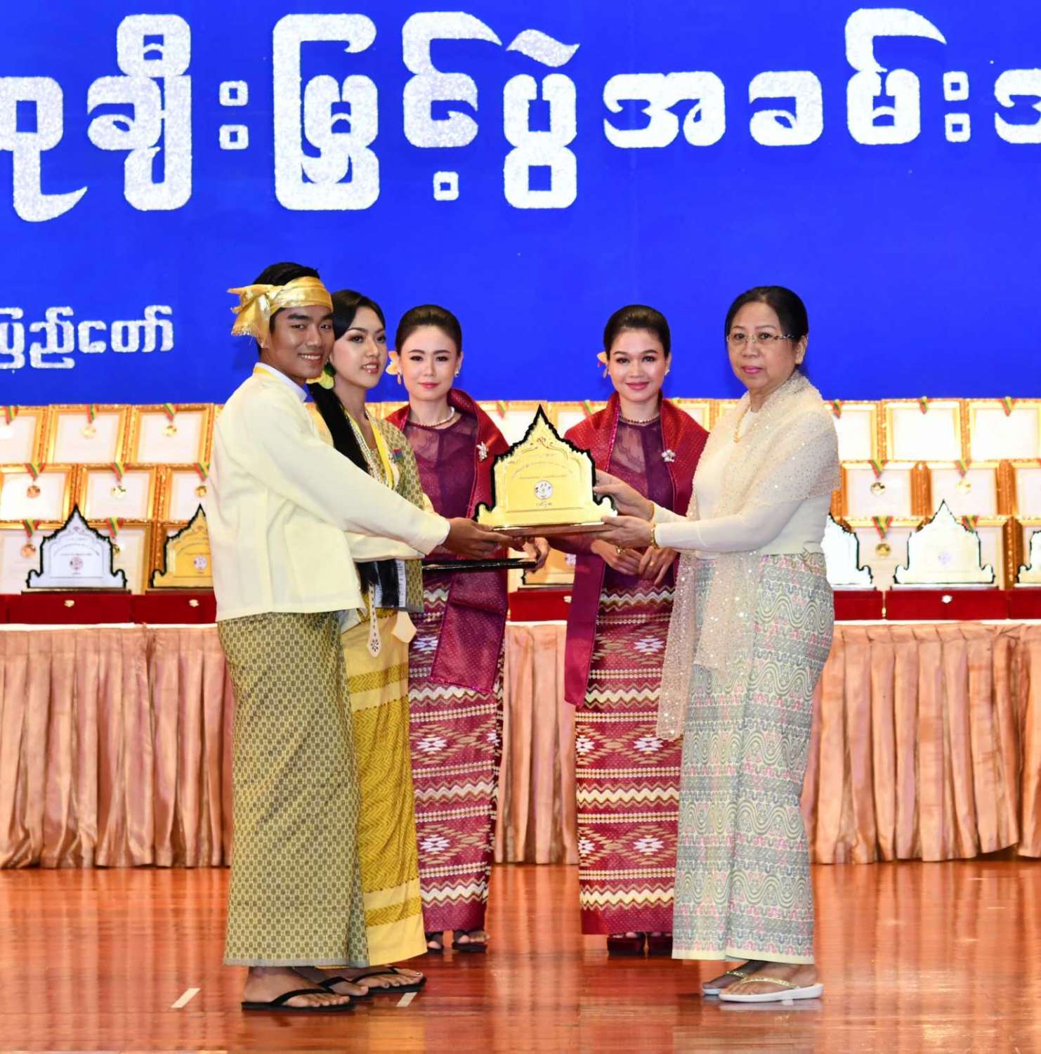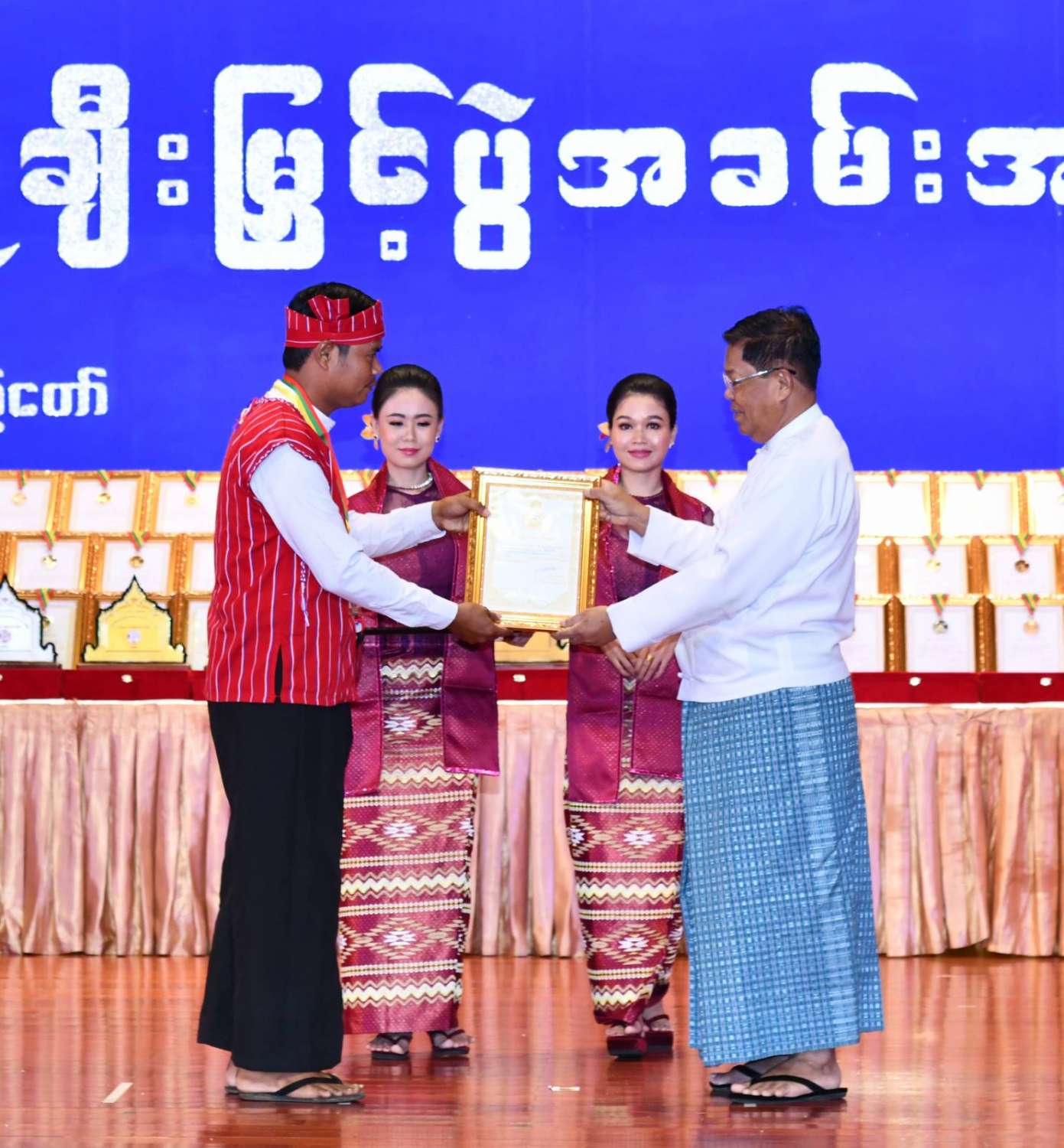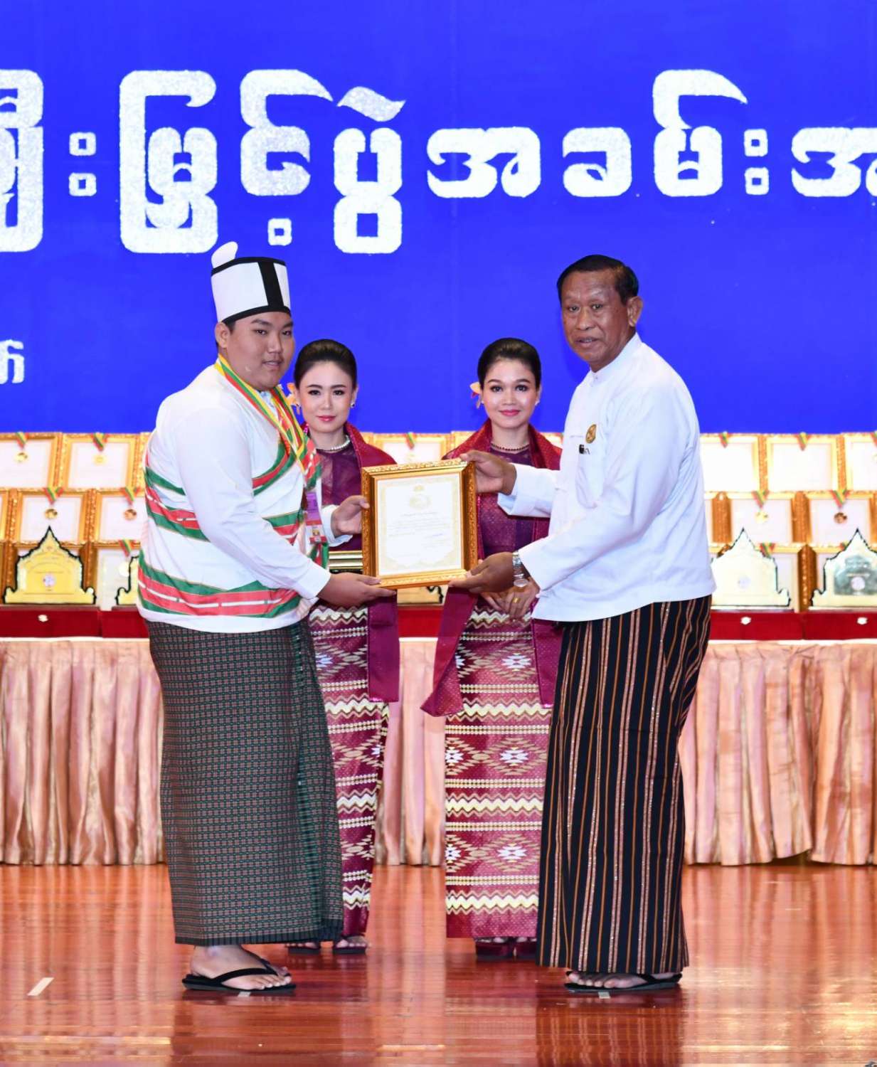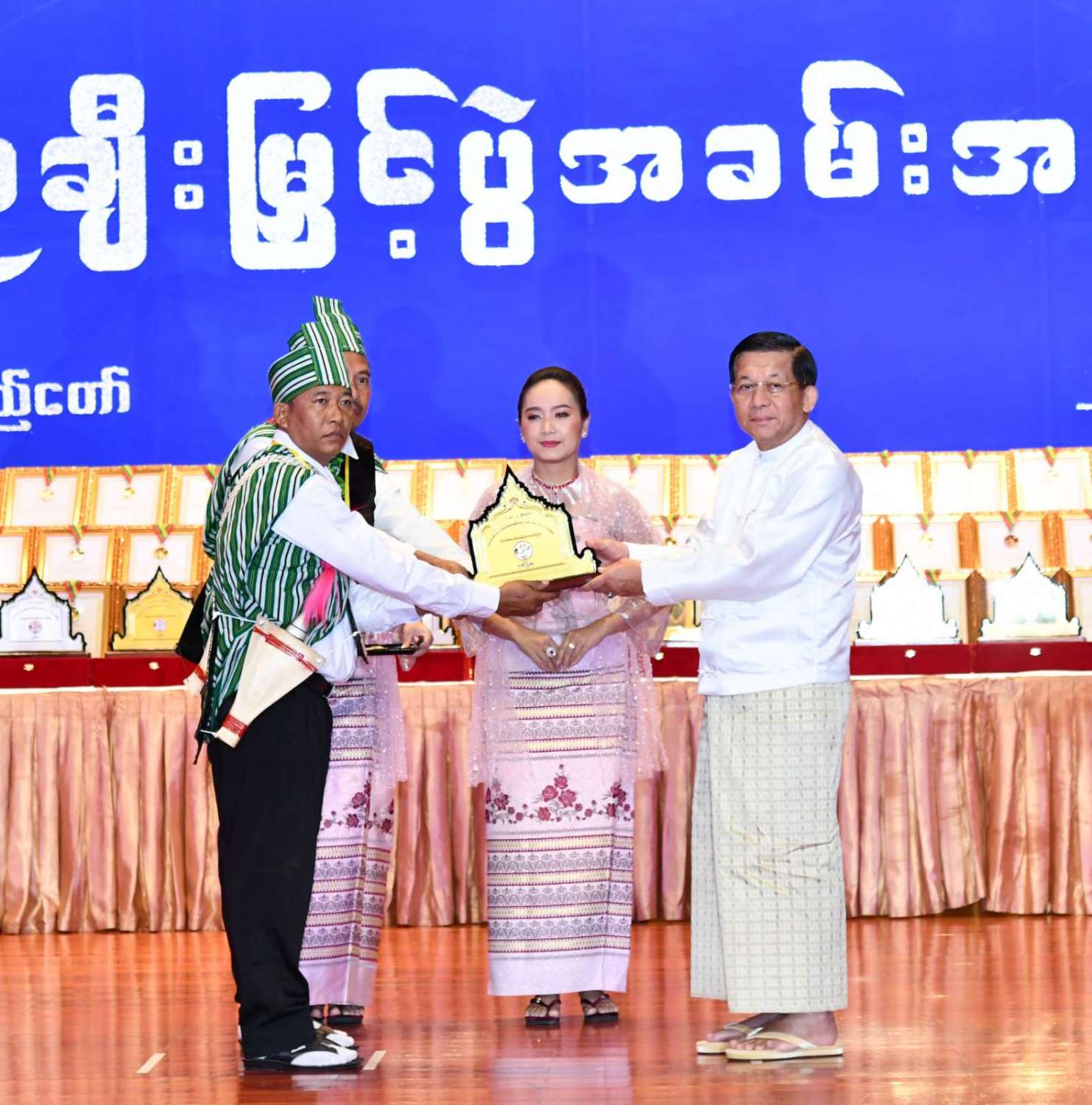 ထို့နောက် ဆုများပေးအပ်ချီးမြှင့်ရာ နိုင်ငံတော်စီမံအုပ်ချုပ်ရေးကောင်စီဥက္ကဋ္ဌ နိုင်ငံတာ်ဝန်ကြီးချုပ်က ကချင်၊ ကယား၊ ကရင်၊ ချင်း၊ မွန်၊ ရခိုင်နှင့် ရှမ်းပြည်နယ်တို့မှ တိုင်းရင်းသားရိုးရာ အကအဖွဲ့များကိုလည်းကောင်း၊ နိုင်ငံတော်စီမံအုပ်ချုပ်ရေးကောင်စီဥက္ကဋ္ဌ နိုင်ငံတာ်ဝန်ကြီးချုပ်၏ ဇနီးက စစ်ကိုင်းတိုင်းဒေသကြီး၊ တနင်္သာရီတိုင်းဒေသကြီး၊ ပဲခူးတိုင်းဒေသကြီး၊ မကွေးတိုင်းဒေသကြီး၊ မန္တလေးတိုင်းဒေသကြီး၊ ရန်ကုန်တိုင်းဒေသကြီးနှင့် ဧရာဝတီတိုင်းဒေသကြီးတို့မှ ကျေးလက်ရိုးရာယဉ်ကျေးမှုအဖွဲ့များကို လည်းကောင်း ဂုဏ်ပြုဆုများ ပေးအပ်ချီးမြှင့်သည်။